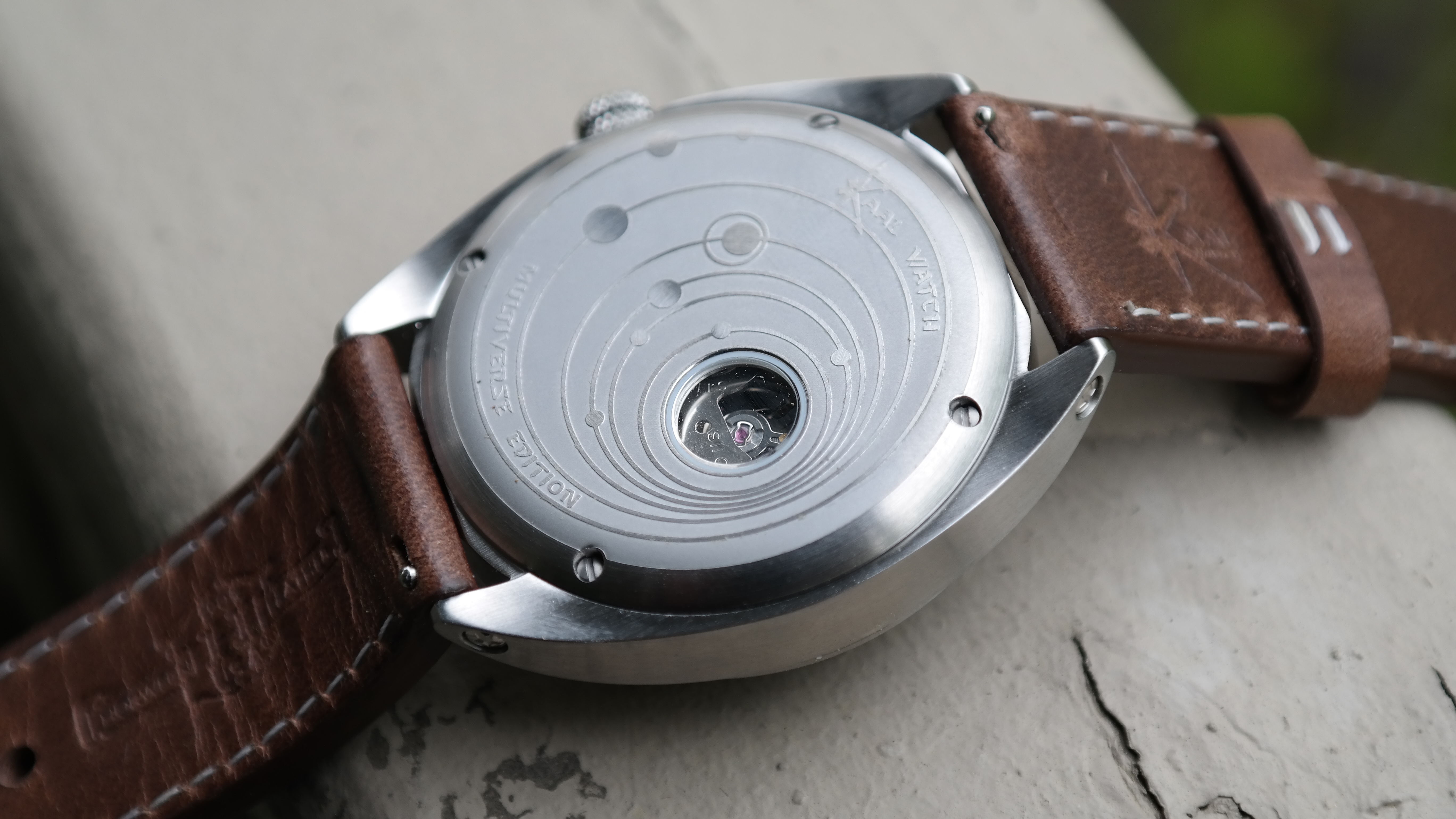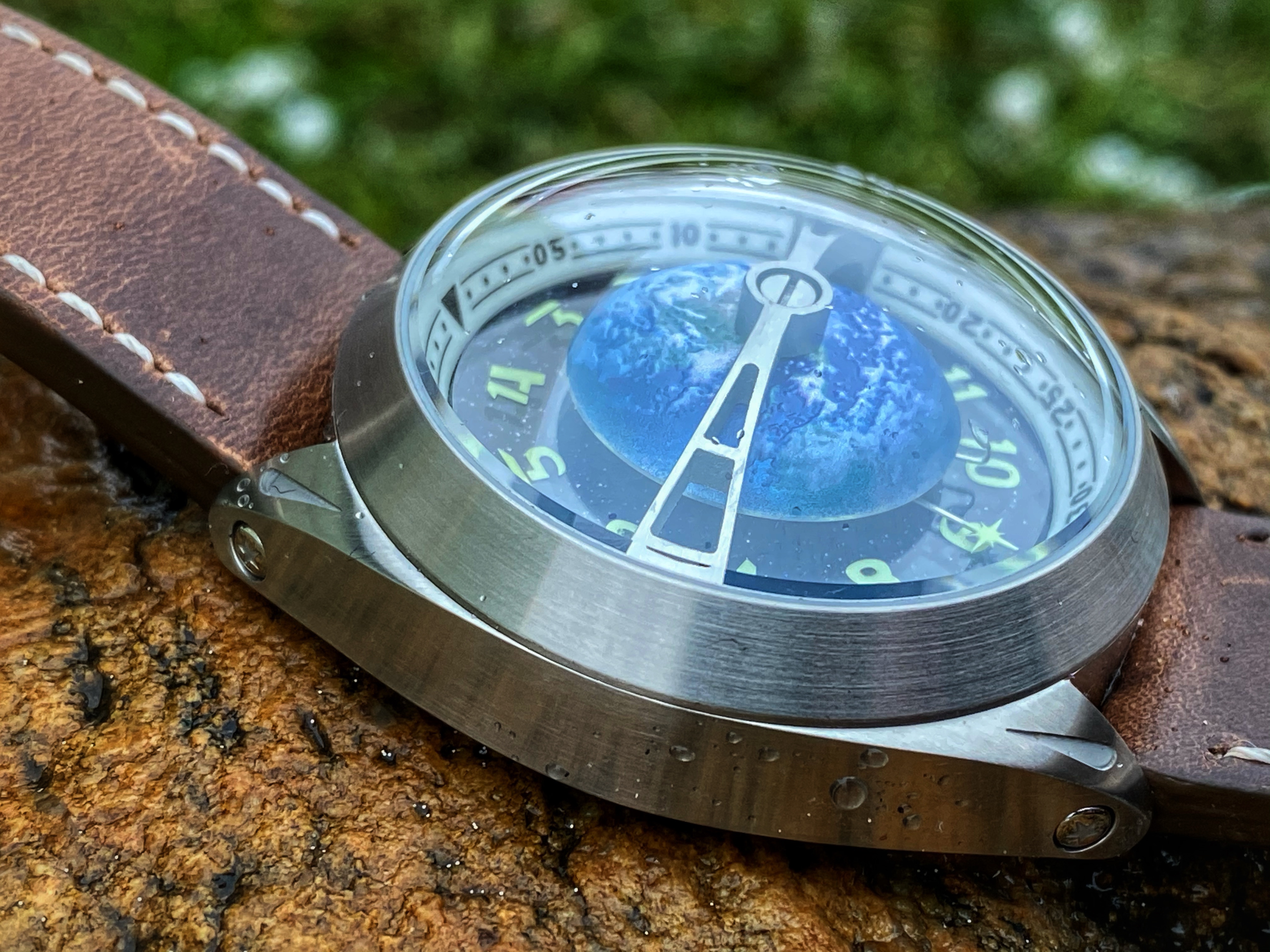 Kaal is already working on improving the Multiverse from what you see on the prototypes in this review and what you will see on the actual production pieces. I posted a list of all the expected changes that are being made as you read this. There are so many little endearing details on this avant-garde beauty both on the dial and on the case. The brushed finishing on the Multiverse case is nearly as good as it gets. The brushed finish in my opinion was the right way to go as opposed to having a high polished case because a. It wouldn’t be cohesive with the overall design of the watch and b. It would distract from the main focal point clearly being the dial. The Earth/Moon/Sun are attached to the dial with a semi skeletonized “metal bridge” with a nice ark that follows the curvature of the crystal and planet. From the bigger details such as the crystal and dial, to the smaller details such as the comet engraved lugs and star head faux screw bars, all of these details impressed me. The bright glow of the lume on the Multiverse is also quite impressive. I do wish that the star head faux screw bars were actual functioning screw bars as opposed to the quick release style.