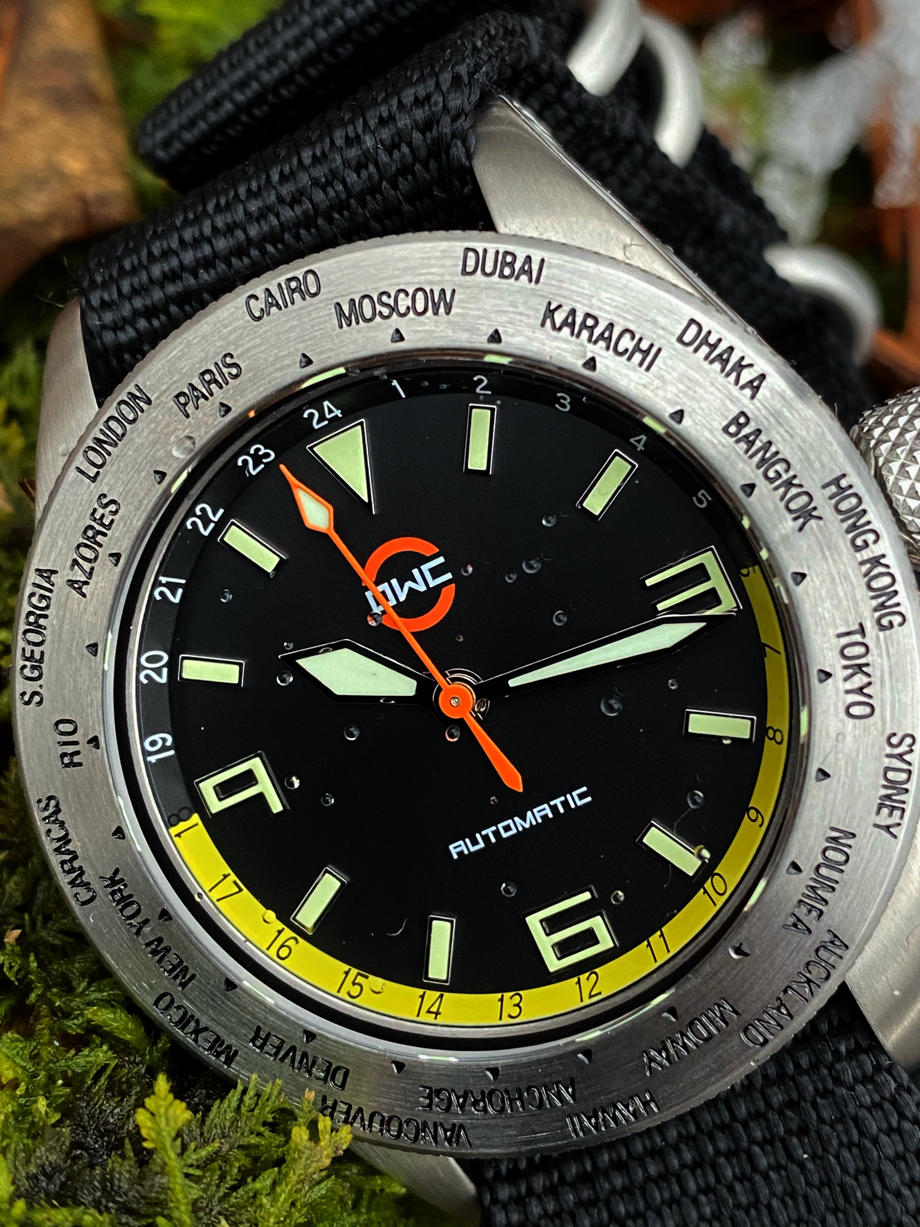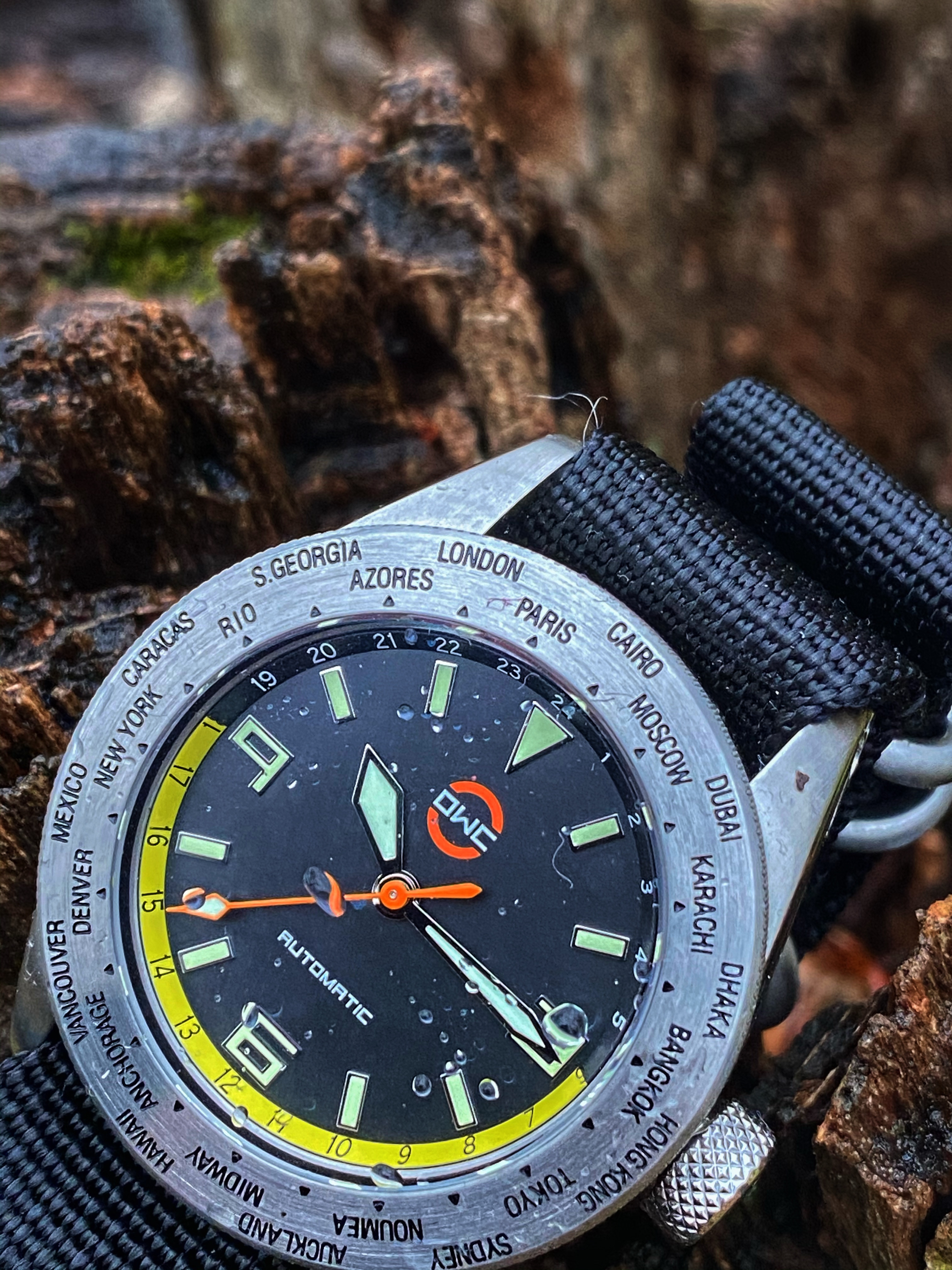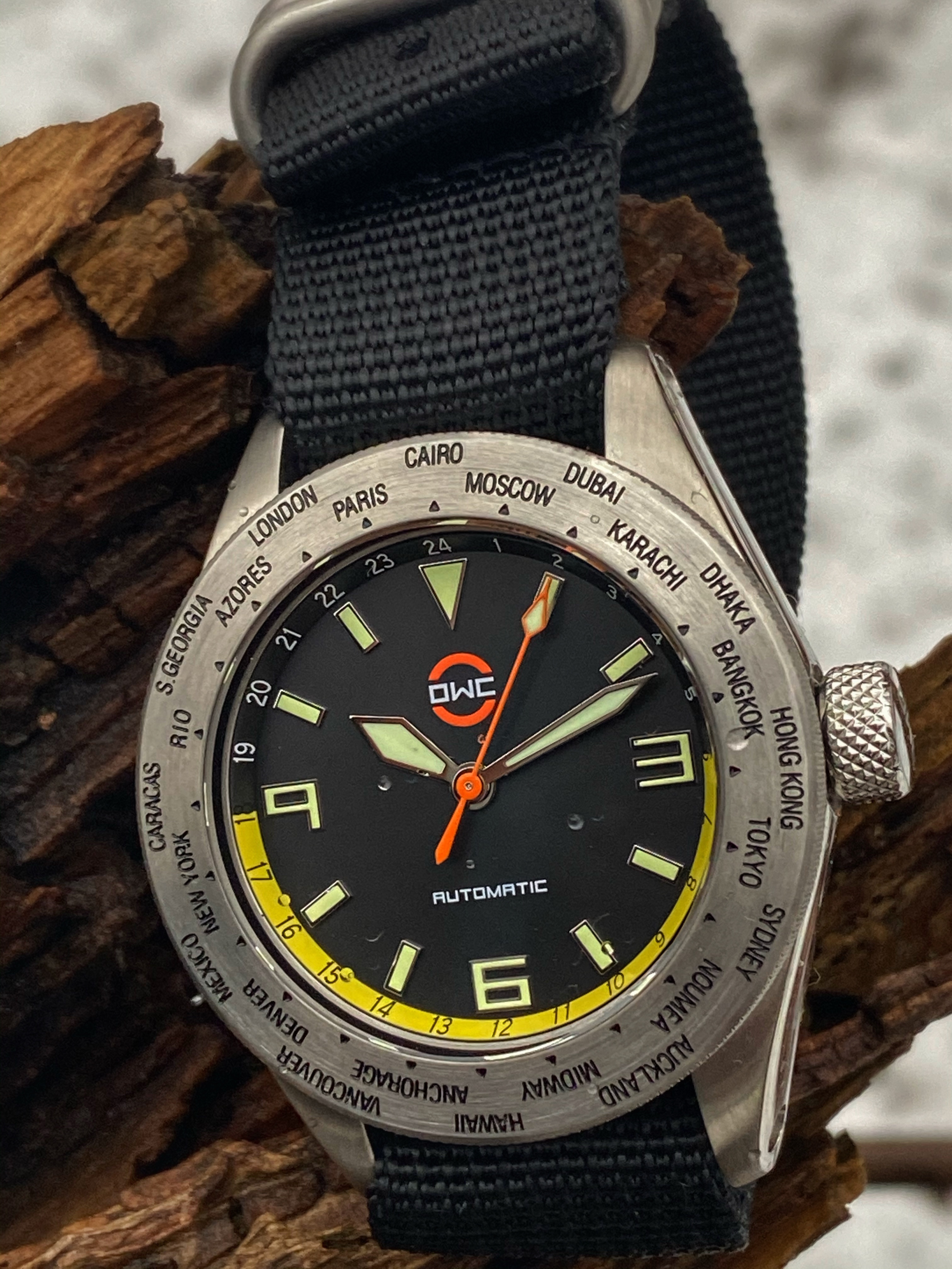 If I remember correctly, it was over a year ago when I first saw the WT-1884 prototype. WT stands for world timer which I am sure you can tell by just looking at the watch. The bezel features the major cities of the world on it. To use this function is quite simple. For example if it’s 1:00 pm in your current location and you want to know what time it is in a specific city. First you line up your time zone/city on the bezel with 1300 on the chapter ring, then you look at where the specific city you want to know is lined up with the number on the chapter ring. The numbers are easy to read and the legibility is increased because the chapter is separated into AM/PM colored sections. Lining up the cities with the chapter is also made easy because the knurled edges are easy to grip, the bezel has smooth rotating function and everything lines up with precision. All of these details are a great example of OWC’s focus on engineering over fashion mantra.
