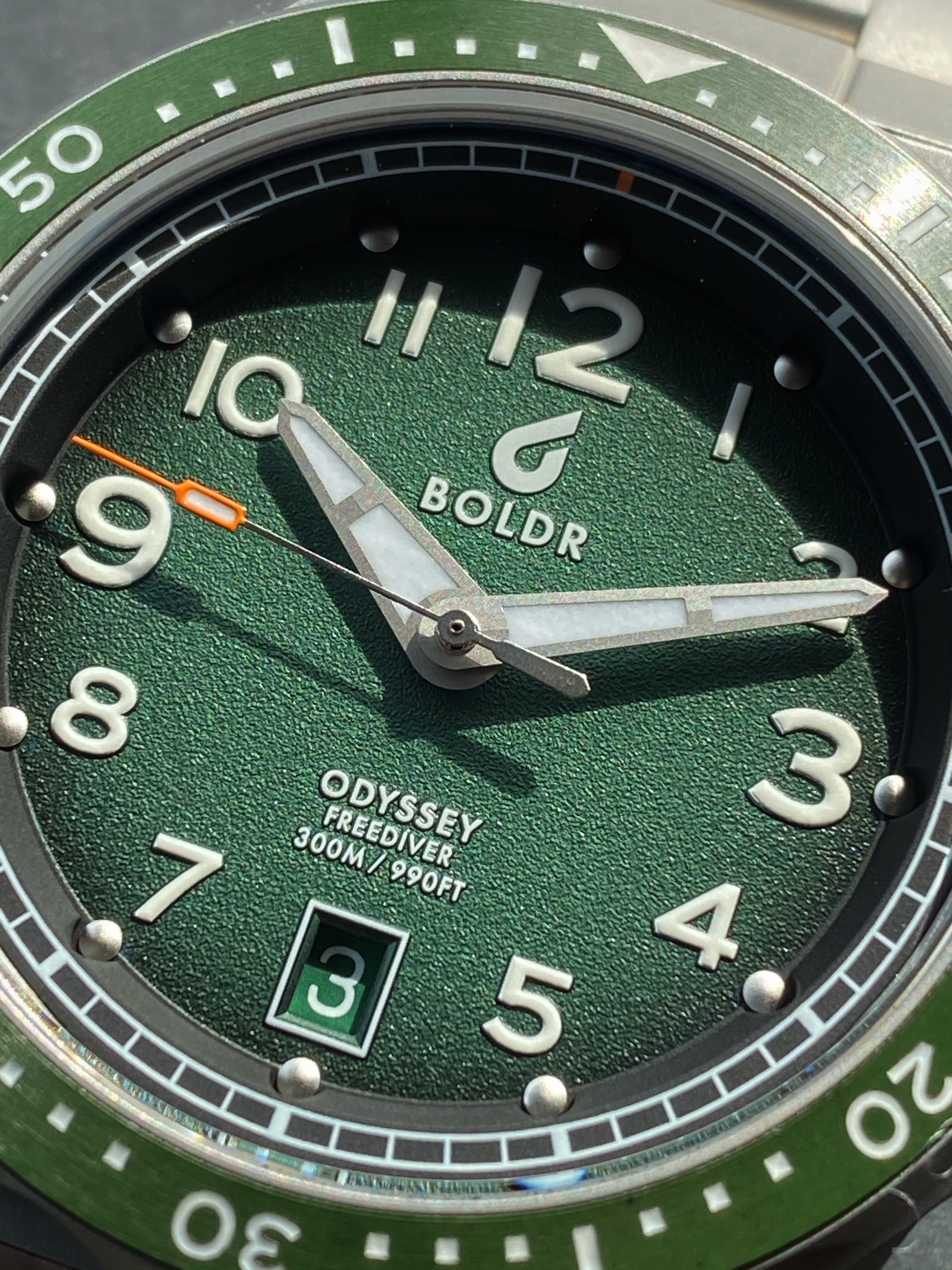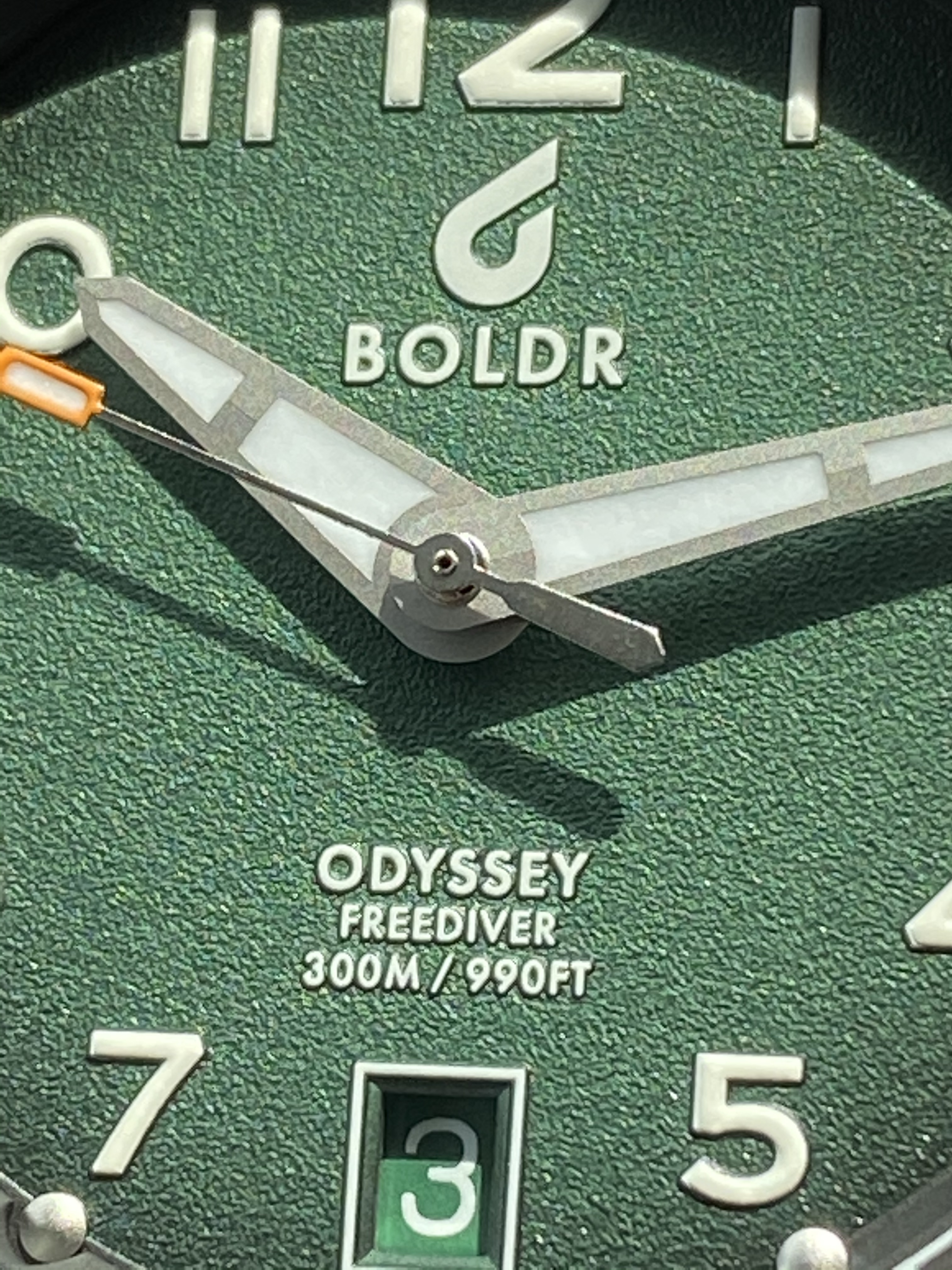 What’s a watch without it’s dial? Well without the dial it’s just a bracelet. The Freediver features a beautiful ombré textured, matte green dial. The color and texture is a welcome addition because I find myself always gravitating towards what I know & love. Matte black dials are my go to, so breaking from that comfort zone does make me hesitant but when that break works out, it’s definitely refreshing. The raised white numerals allow the Freediver to have optimal daytime legibility. The team at BOLDR knows that we love good lume on a dive watch so they made sure not to disappoint because they gave the Freediver a generous serving of Swiss Superluminova. I am so glad for the BOLDR team’s attention to functional details. Those details can be found on the Freediver’s custom matte hands. The hands are perfectly proportioned to the dial. Ensuring that optimal legibility, the hands are coated with Swiss Superluminova. The second hand is designed with an orange rectangular tip that is also coated with lume for that optimal legibility in low lighting situations.