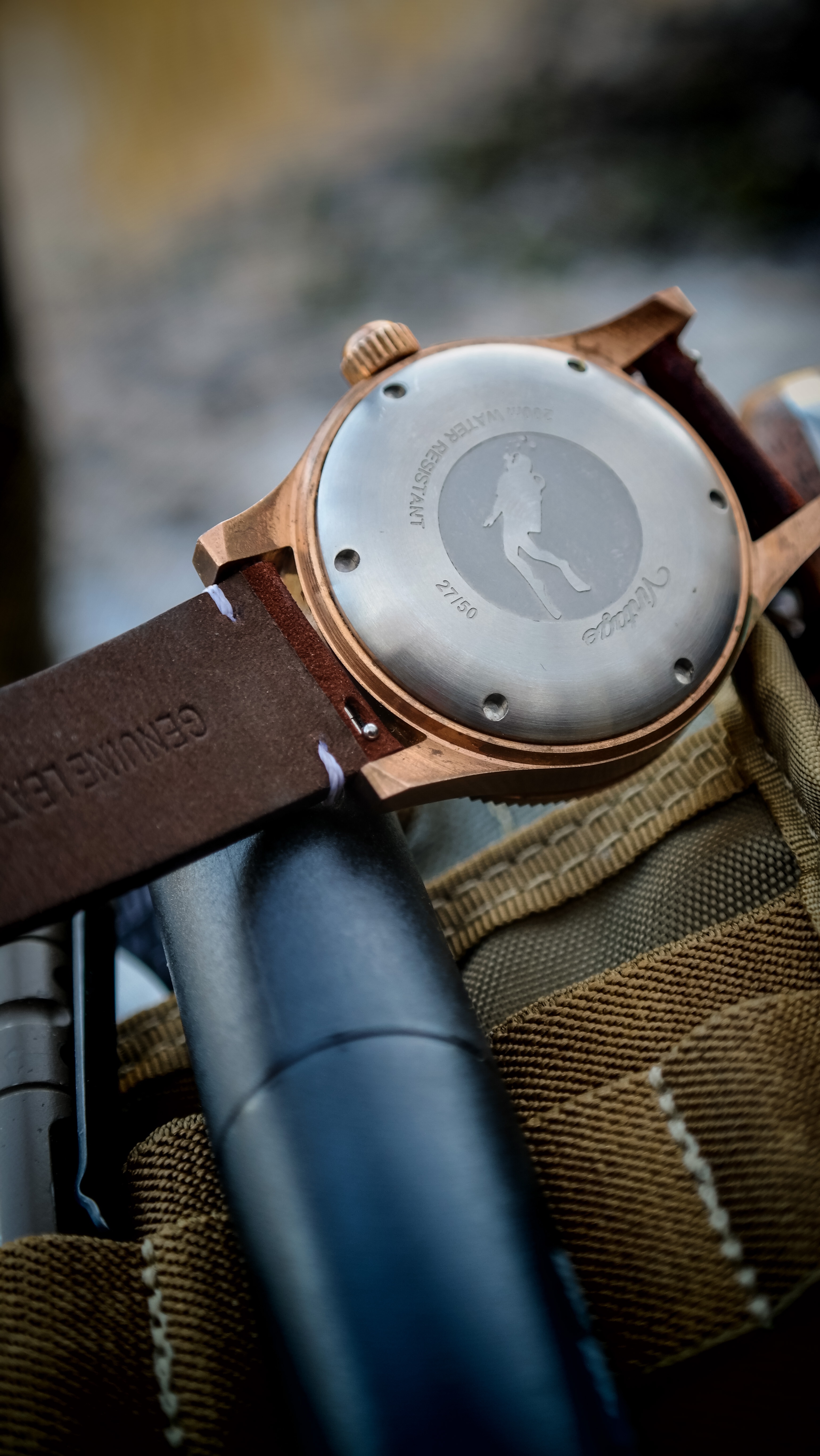 The CuSn8 bronze case seemed to start the natural patina process on day one. Bronze cases are always changing and for me that is definitely one of the more appealing draws to bronze. I like how FN included a matching CuSn8 bronze buckle on the leather strap. A definite welcome addition of consistency. The curved lugs of the Vintage combined with the dimensions of the case allow the watch to nicely hug the wrist ever so comfortably. Fonderia Navale finished the case off beautifully by two details that might be my favorite on the Vintage. The raised sapphire crystal and the etched stainless steel case back are those two details. As you can see in the pictures, the crystal is quite spectacular as it sits higher than the bezel which is a nice nod to the dive watches of yesteryear. The etched scuba diver on the rounded case back finishes off the Vintage with a touch of thoroughness of vintage personality. The stainless steel case back screws into the case back. In addition to the scuba diver, there are details about the watch itself including the watch number xx/50, the model name and the water resistance.(200m)