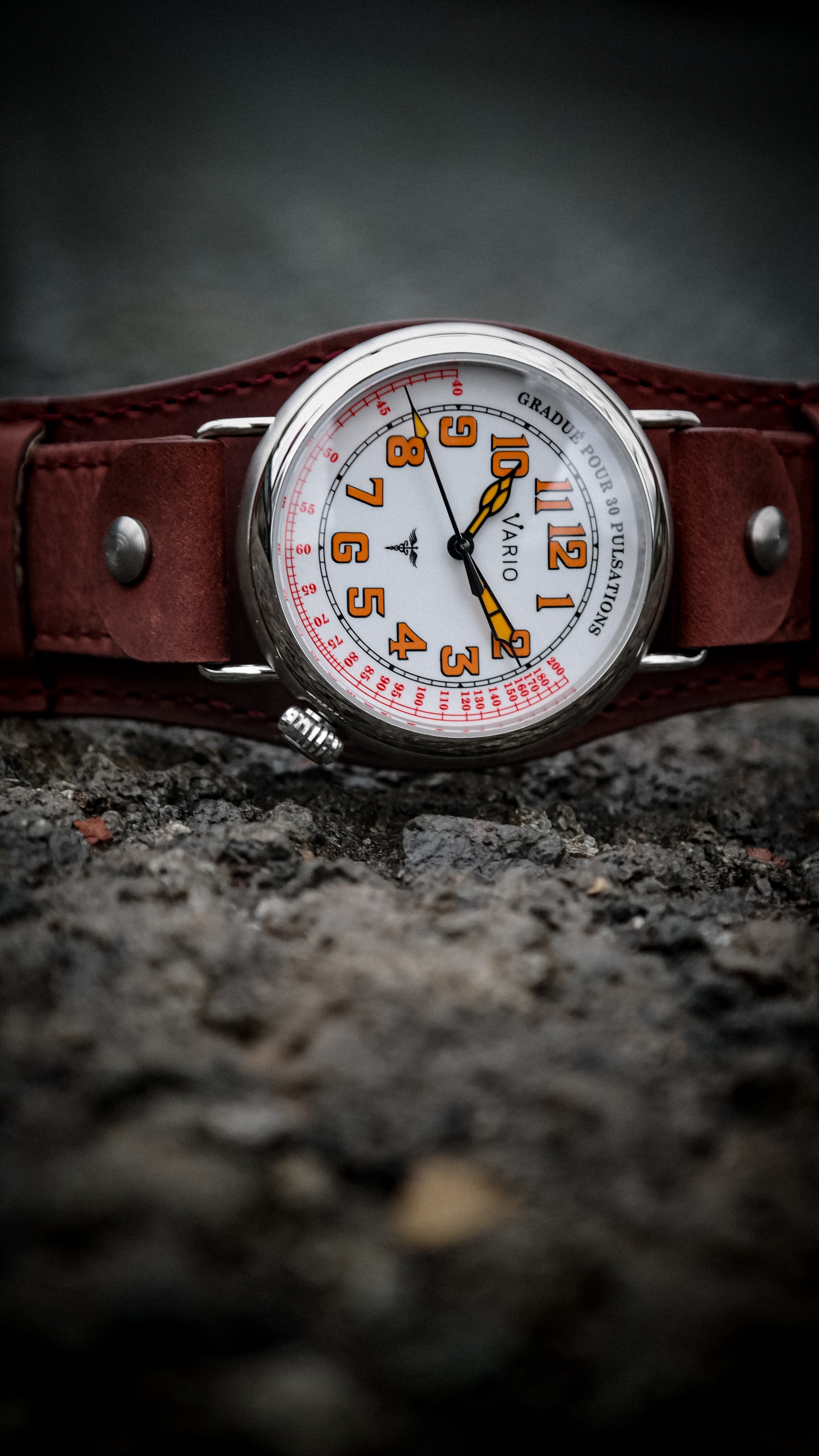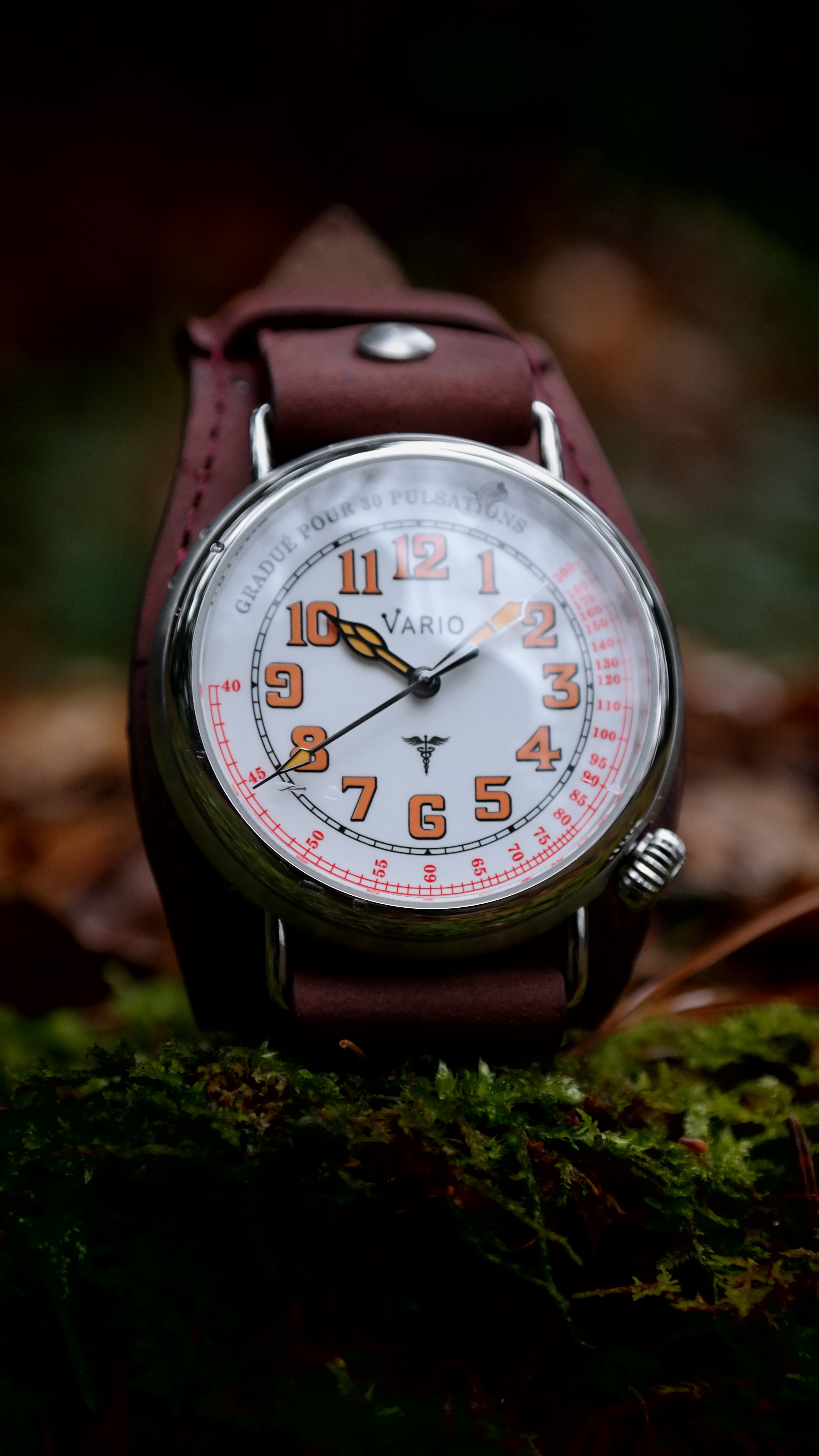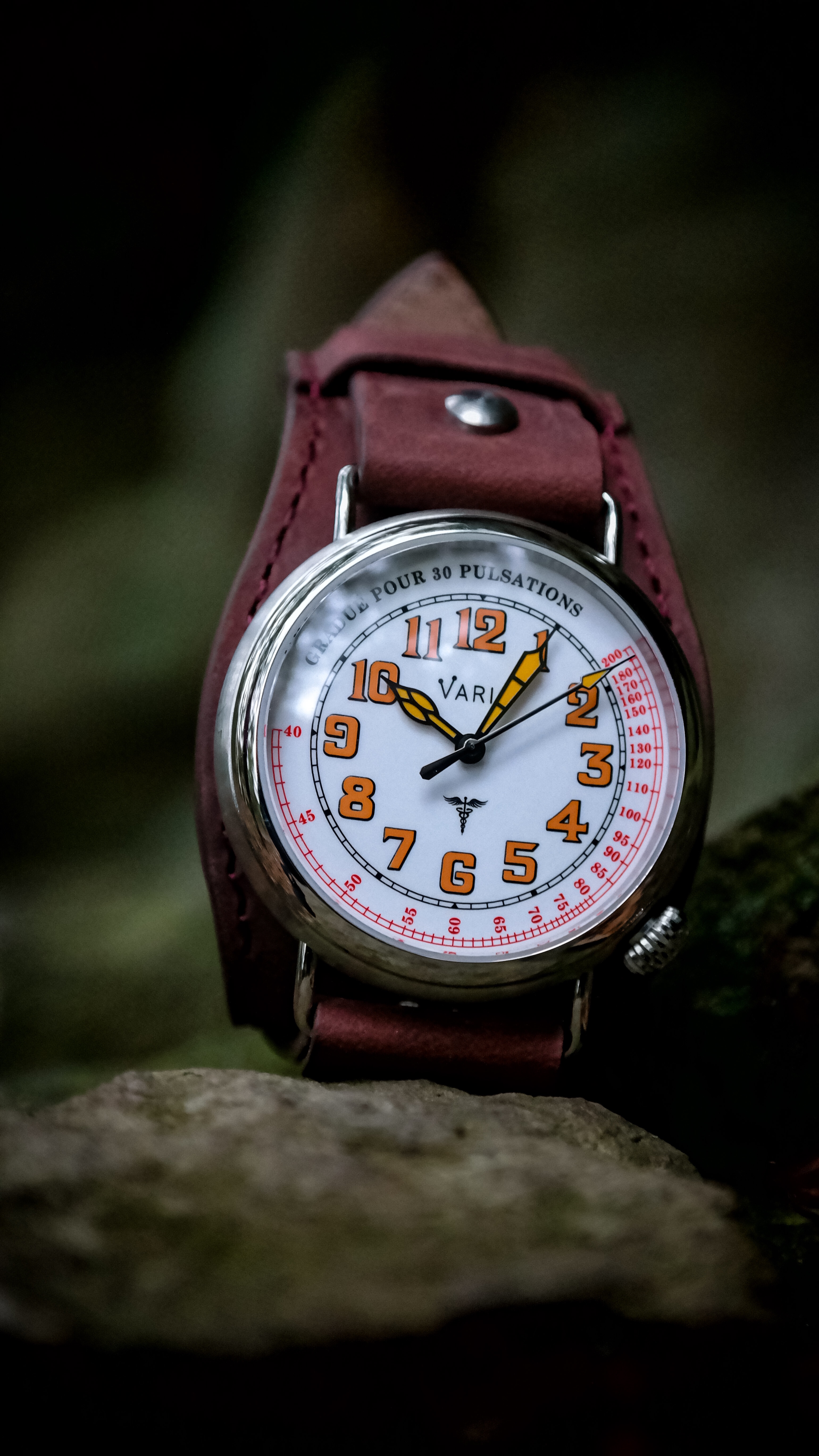 This version of Vario’s trench watch is the medic model. What does that mean and how does it function? Back in the day these types of watches were used by doctors to measure a patient’s pulse. The scale found along the outer edge of this dial is used in conjunction with the watch’s seconds hand to provide the medical information on the patient. This pulsometer scale is calibrated to 30 heartbeats (or pulsations). To use this measurement scale start counting the beats/pulses when the second hand reaches 12 and stop when you get to 30 beats/pulses. Whatever number the second hand is pointing to is the measurement that you record.