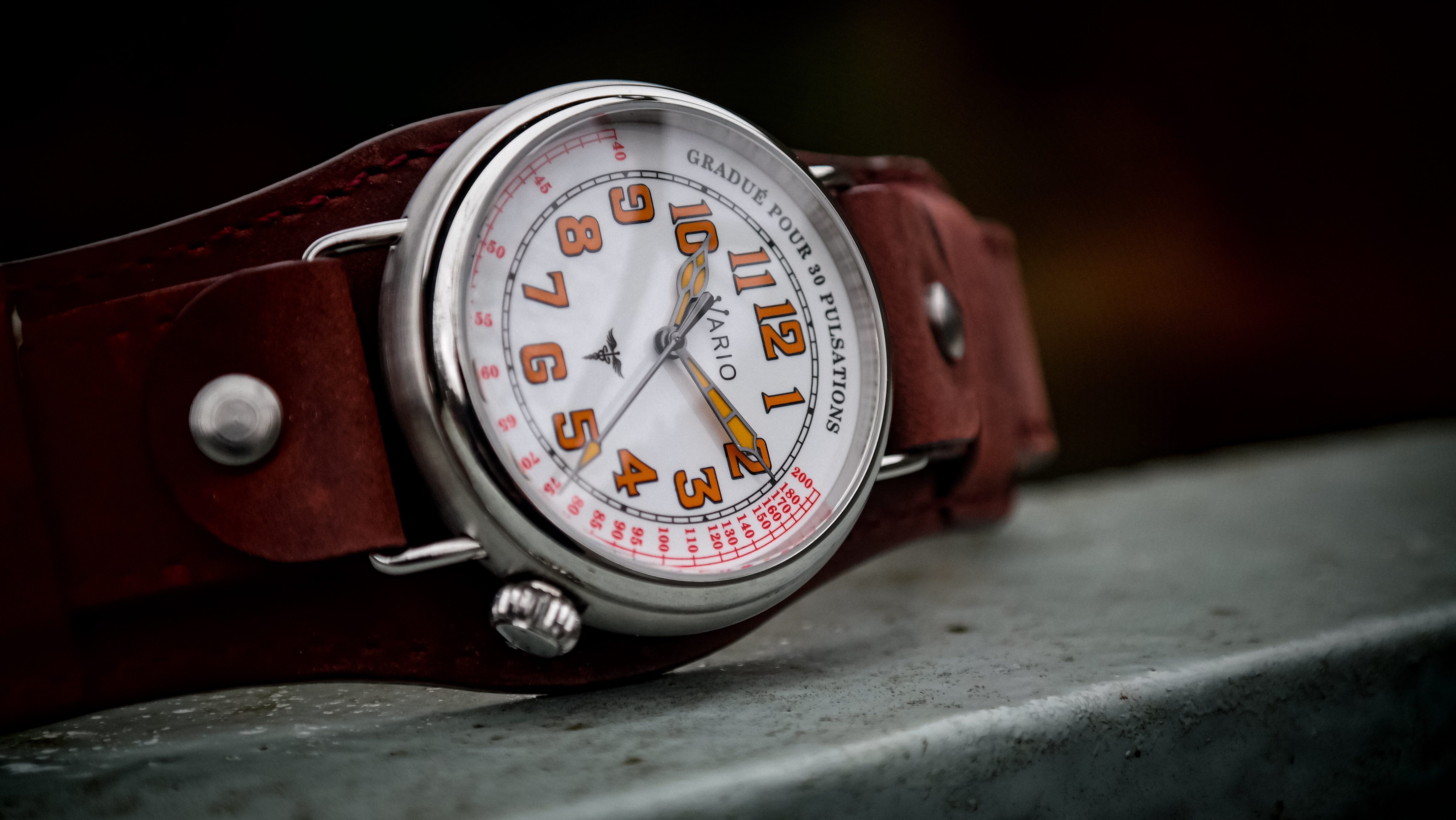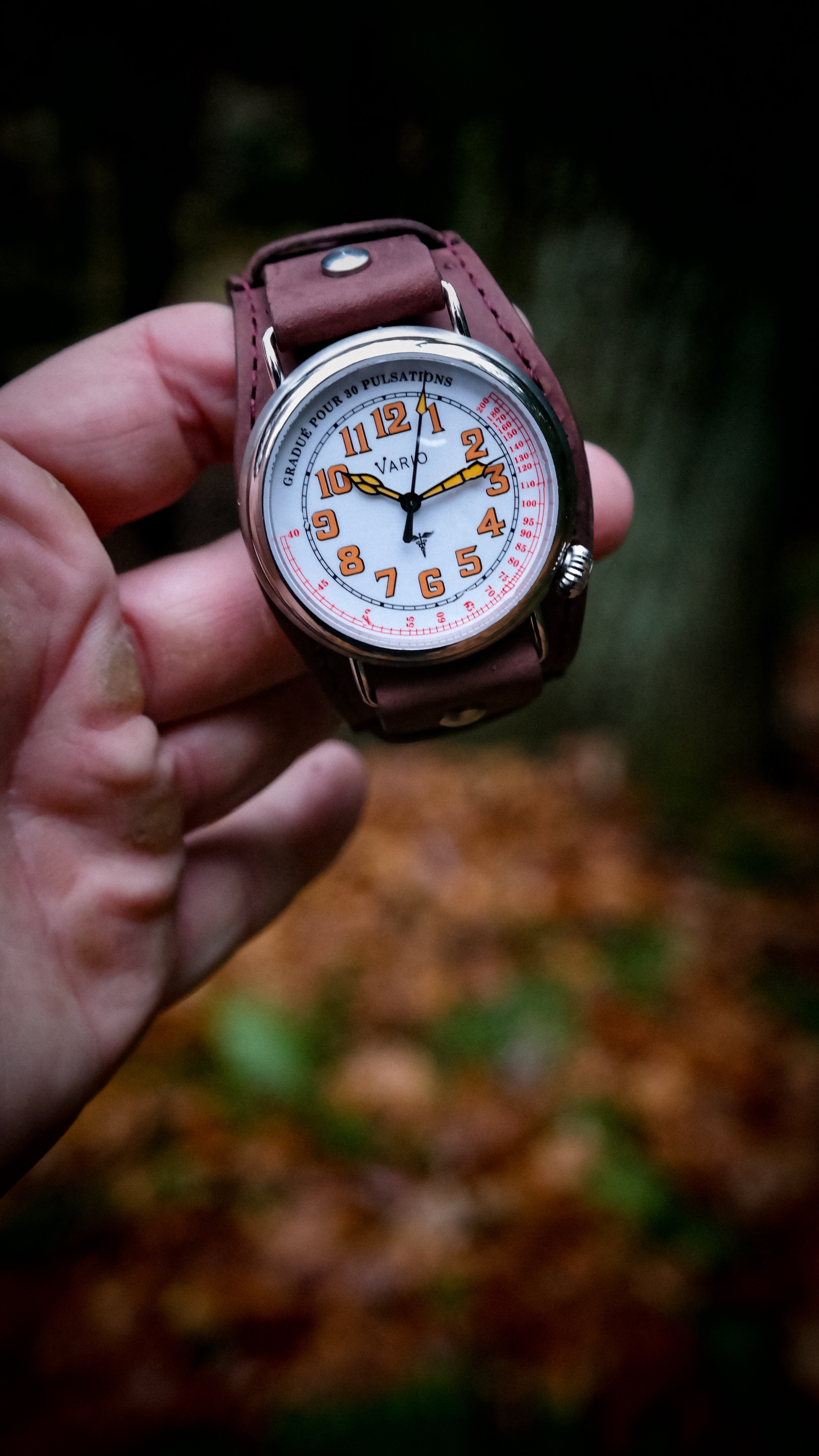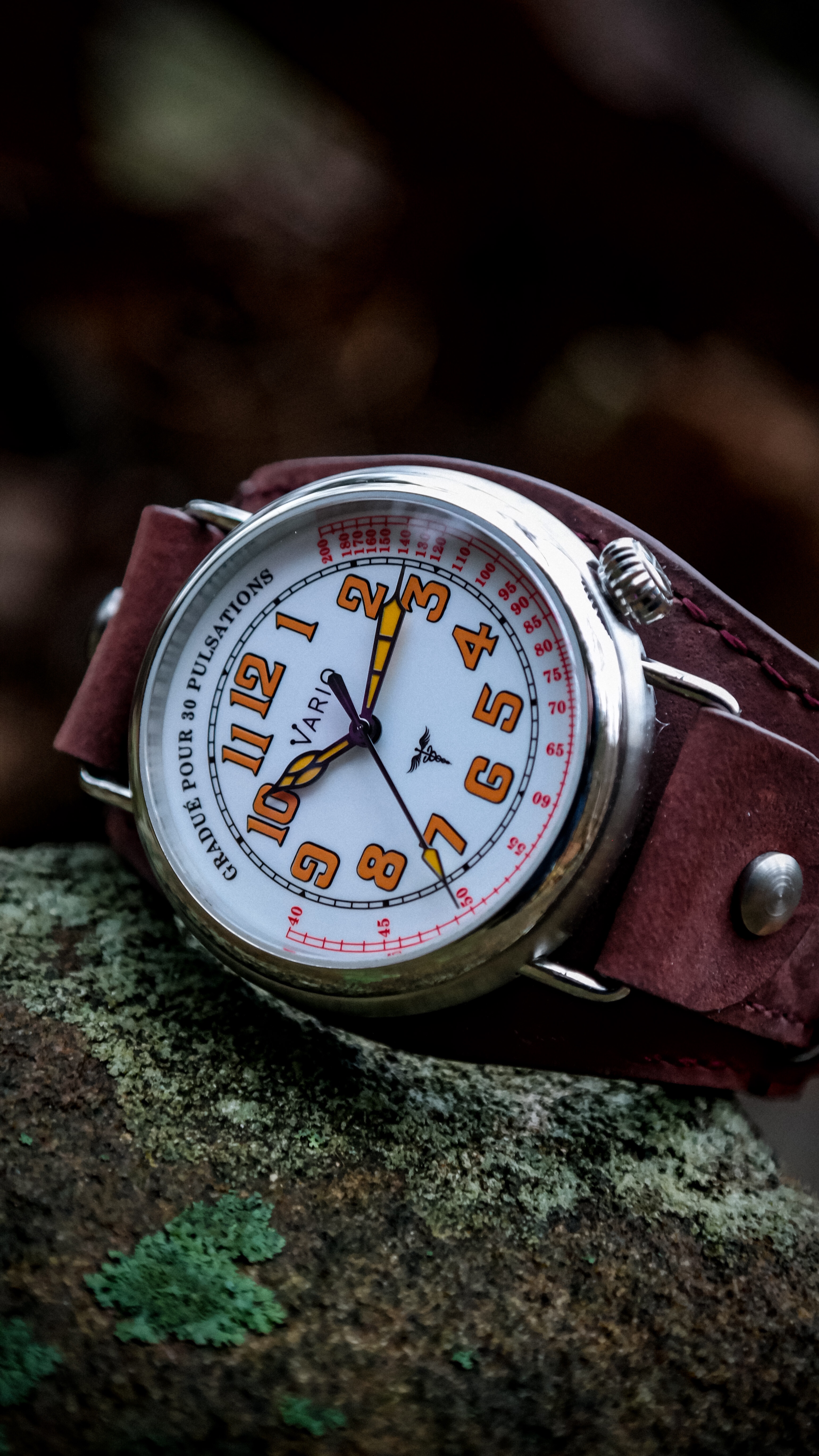 This version of Vario’s trench watch is the medic model. What does that mean and how does it function? Back in the day these types of watches were used by doctors to measure a patient’s pulse. The scale found along the outer edge of this dial is used in conjunction with the watch’s seconds hand to provide the medical information on the patient. This pulsometer scale is calibrated to 30 heartbeats (or pulsations). To use this measurement scale start counting the beats/pulses when the second hand reaches 12 and stop when you get to 30 beats/pulses. Whatever number the second hand is pointing to is the measurement that you record.