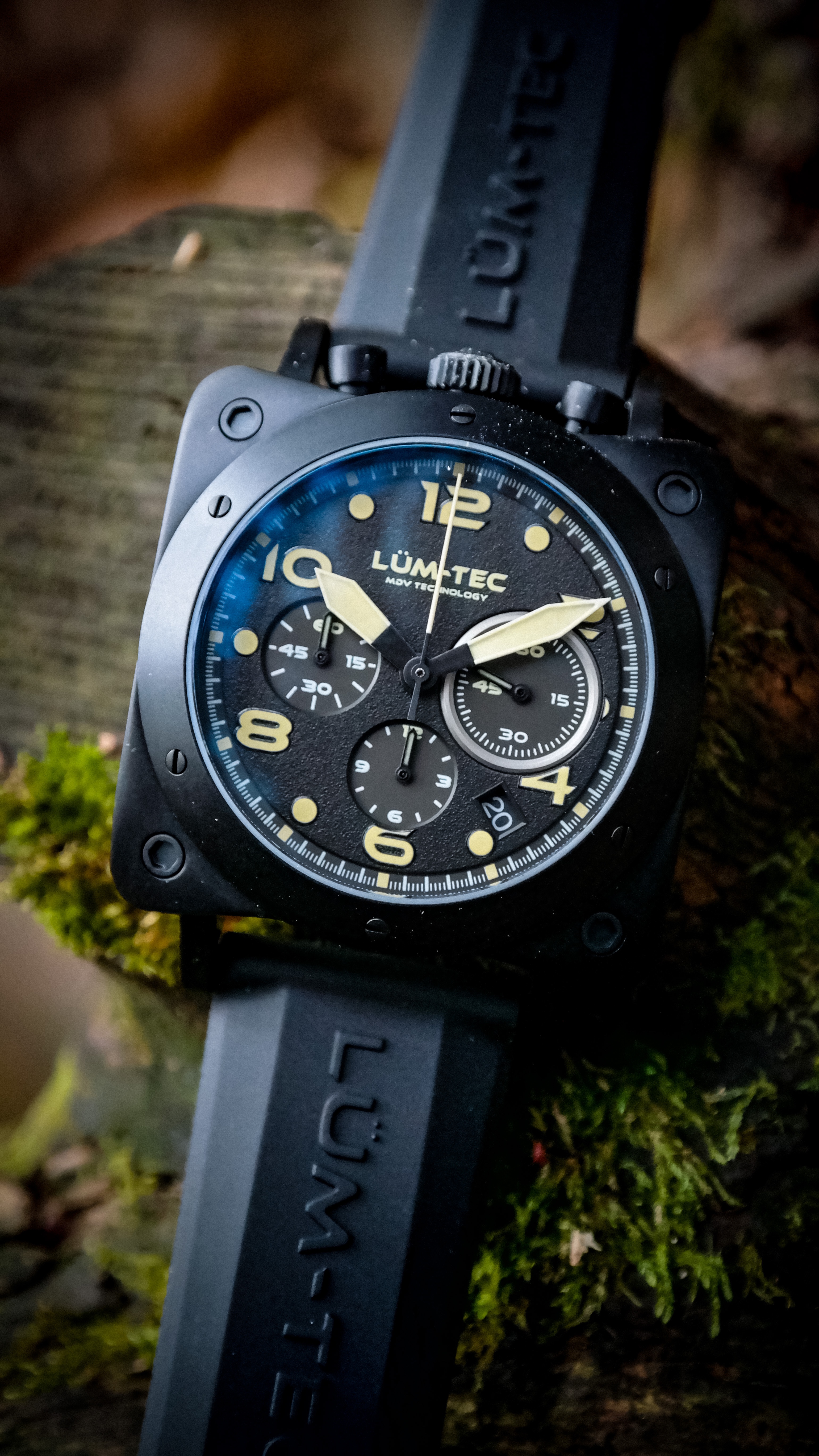 What do you use your chronograph for? Do you use it for work related purposes? Timing during your workouts? Or perhaps making sure you don’t burn dinner? Well whatever you use your chronograph for, the operation and accuracy are what the important factors are for timing your “missions” successfully. The design of the dial allows for some fantastic legibility not only for reading the time but also on each of the sub dials. I like how crisp the button pushers are when operating the chronograph function and I also love how the hands respond with precision. The large sword style hands have faux patina/aged look that works well set against the textured black dial & case. Lum-Tec always assures that their watches are just as legible in the dark as they are during the daylight hours. This is due to the MDV luminous technology on dial and hands. The precise diamond cut hands are coated by X1 grade Super-Luminova which glow like a torch. The combination of numerals and round markers to indicate the hours comes together in a very legible and cohesive display detail. Each hand, including those on the chronograph sub dials are sized perfectly in both length and width which adds to the great legibility of the Bull42.