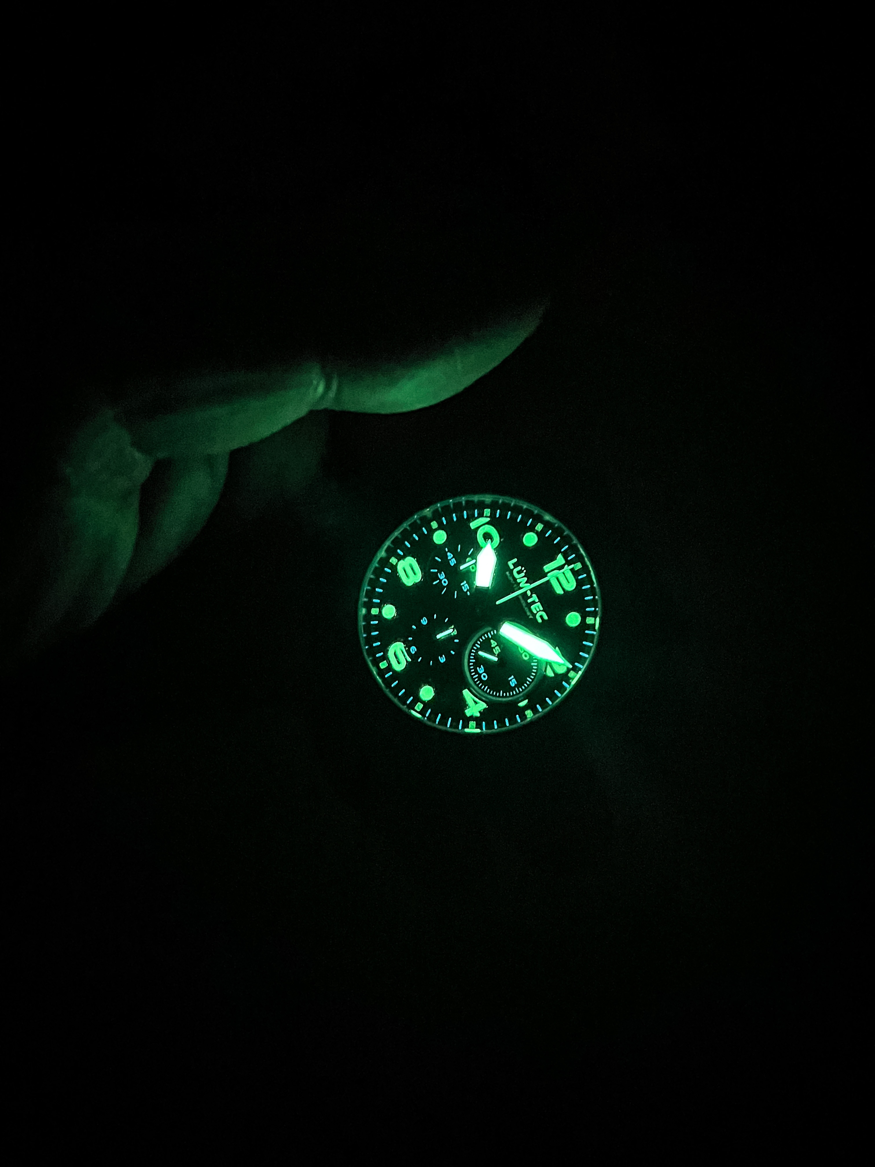 As their name suggests, Lum-Tec watches never disappoint with their flashlight quality lume and that certainly holds true with the Bull42. I like that the Bull42 offers something different from the old sea of the same old designs. The Bull42 is a solid piece that offers a different wearing experience from the typical. The square case offers a refreshing experience on the wrist in terms of comfort, presence and overall appearance. What enhances the comfort experience of this watch is the crown placement because the crown won’t dig into the wrist/back side of the hand, as crowns placed at the 3 o’clock position can. The stealthy black keeps it under the radar with an over the top/in your face look but it’s secret weapon is a symmetrically designed dial that packs a huge legibility punch. What allows that punch to be a knockout blow for me is the detail that Lum-Tec put into the lume application which didn’t stop at the main hands or markers, everything on the dial received that same lume treatment. I love that each of the sub-dial hands and numbers are coated with lume. That’s an example of design dedication that separates the experienced Vs the newbies. The pic below shows exactly what I am referring to.
