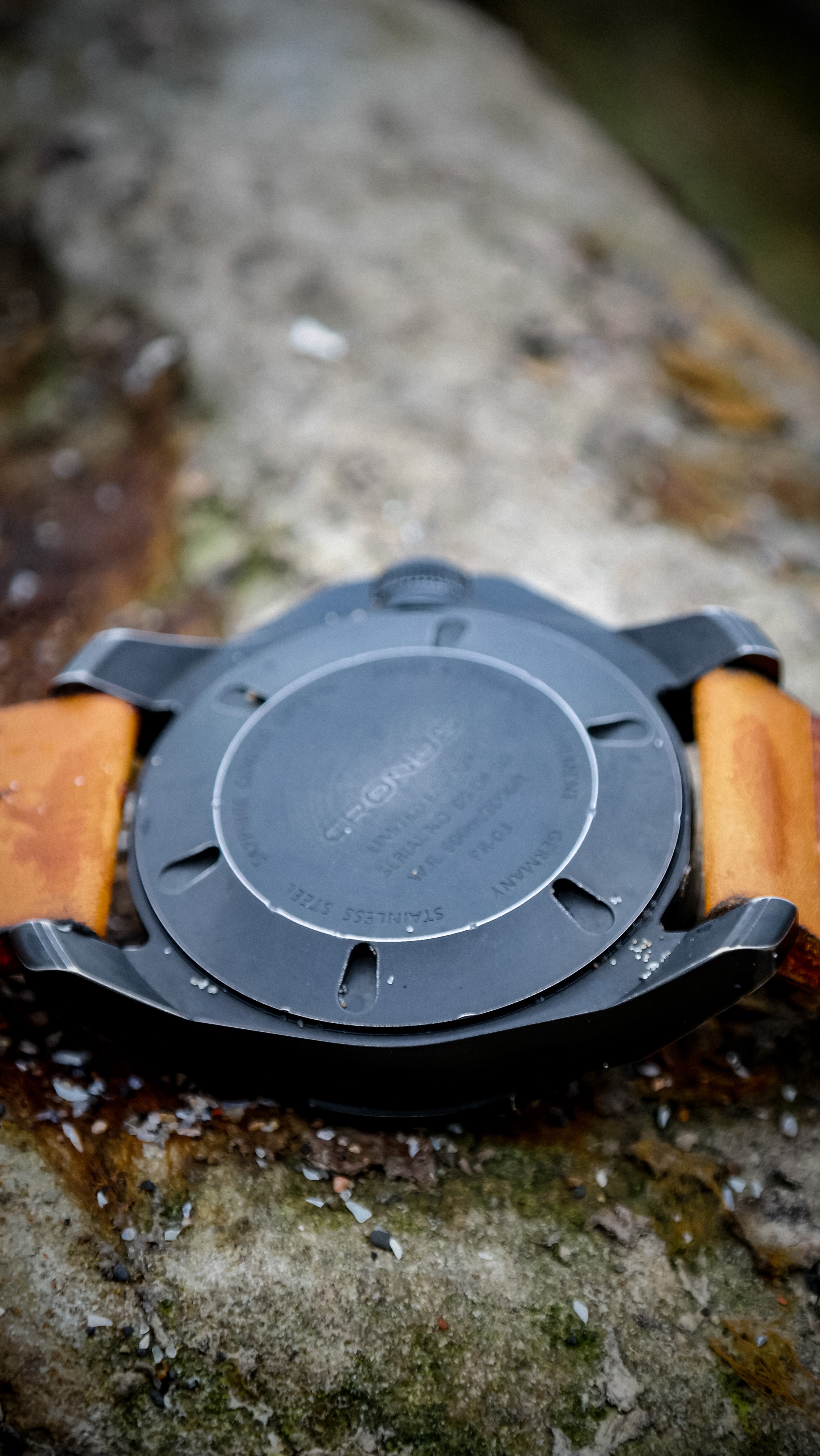 I really like how when the crown is completely screwed down into the closed position, the top of the crown sits perfectly flush to the crown guards. I love the distressed/aging details on the crown and crown guards. Juri did just enough on the crown guards & crown, and to be honest throughout the entire case. The crown itself has some fantastic design details. Details that highlight some of that German engineering that can be found throughout this watch. The 9mm crown is signed with the Cronus ‘C’. I love the red control ring warning system on the crown. The warning is a “red flag” reminder to screw the crown down before diving or submerging in water. The size of the crown and the machined edges of the allow for extreme ease with the actual function of this crown. I’m addicted to manually winding my watches while I’m wearing them, therefore when a watch has an easy to grip and operate crown it will always score higher on my checklist. I guess it’s like an adult version of a fidget spinner for me. The distressing that has been done to the crown and crown guards is done with artistic precision. It gives great character to this case.