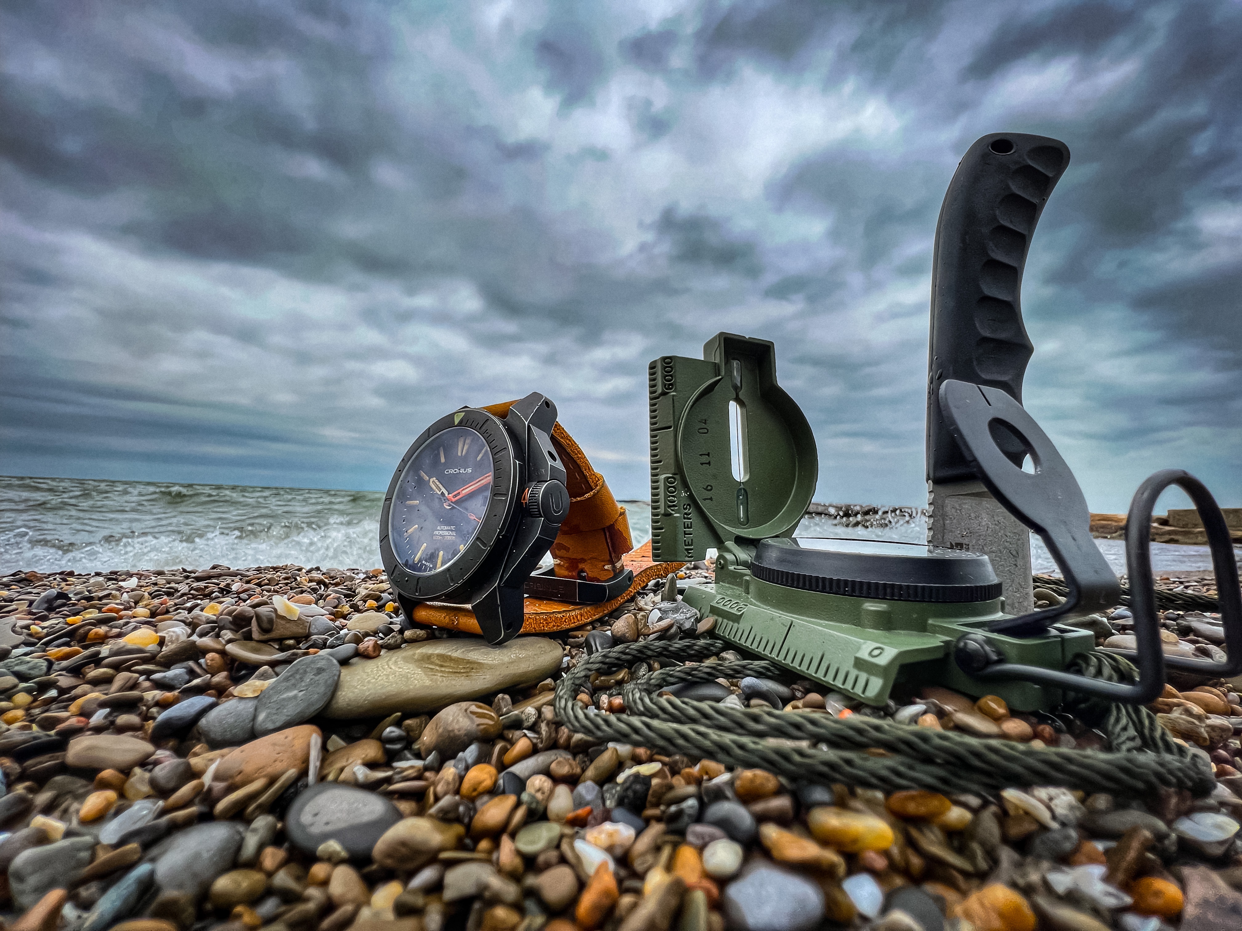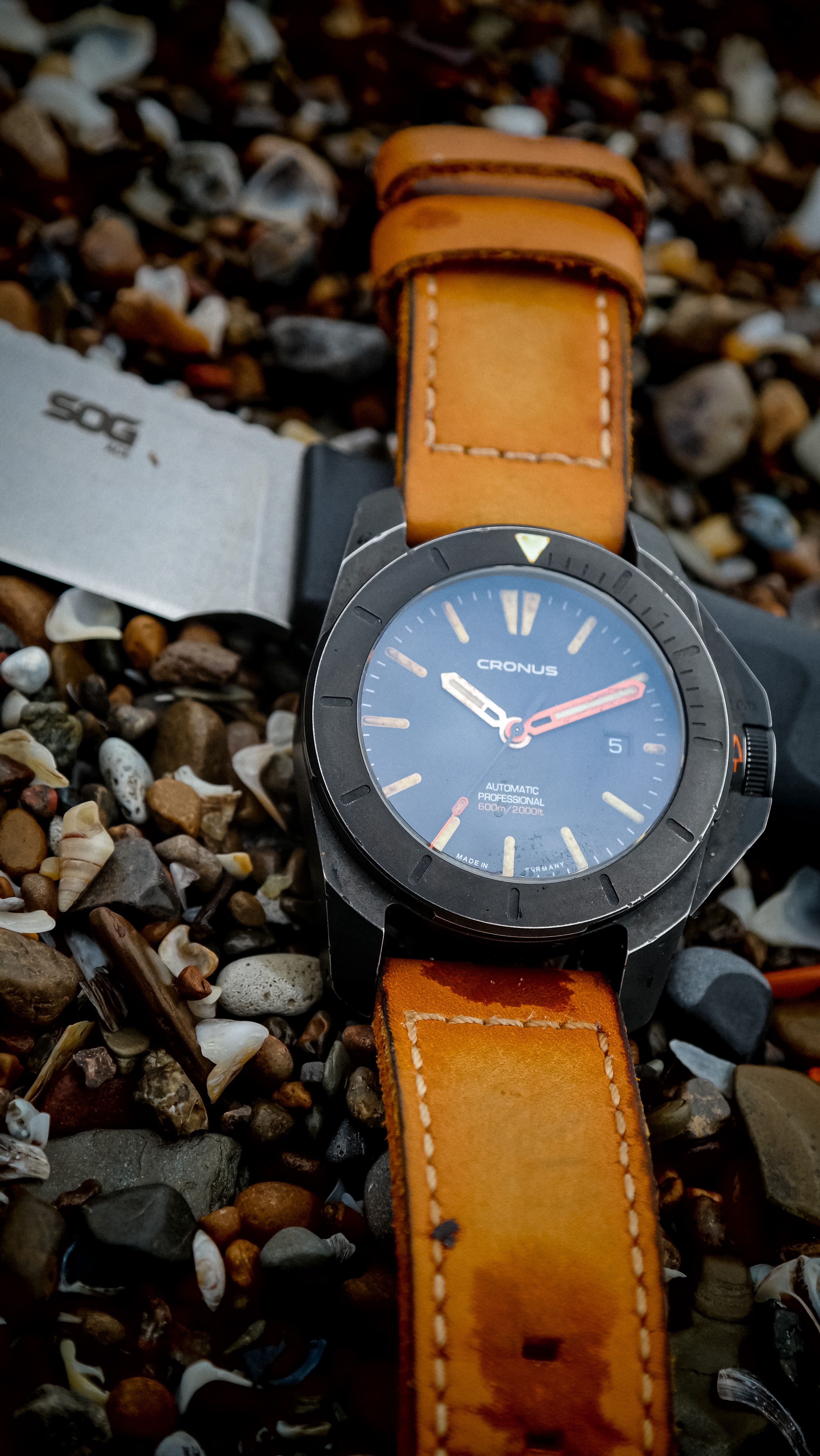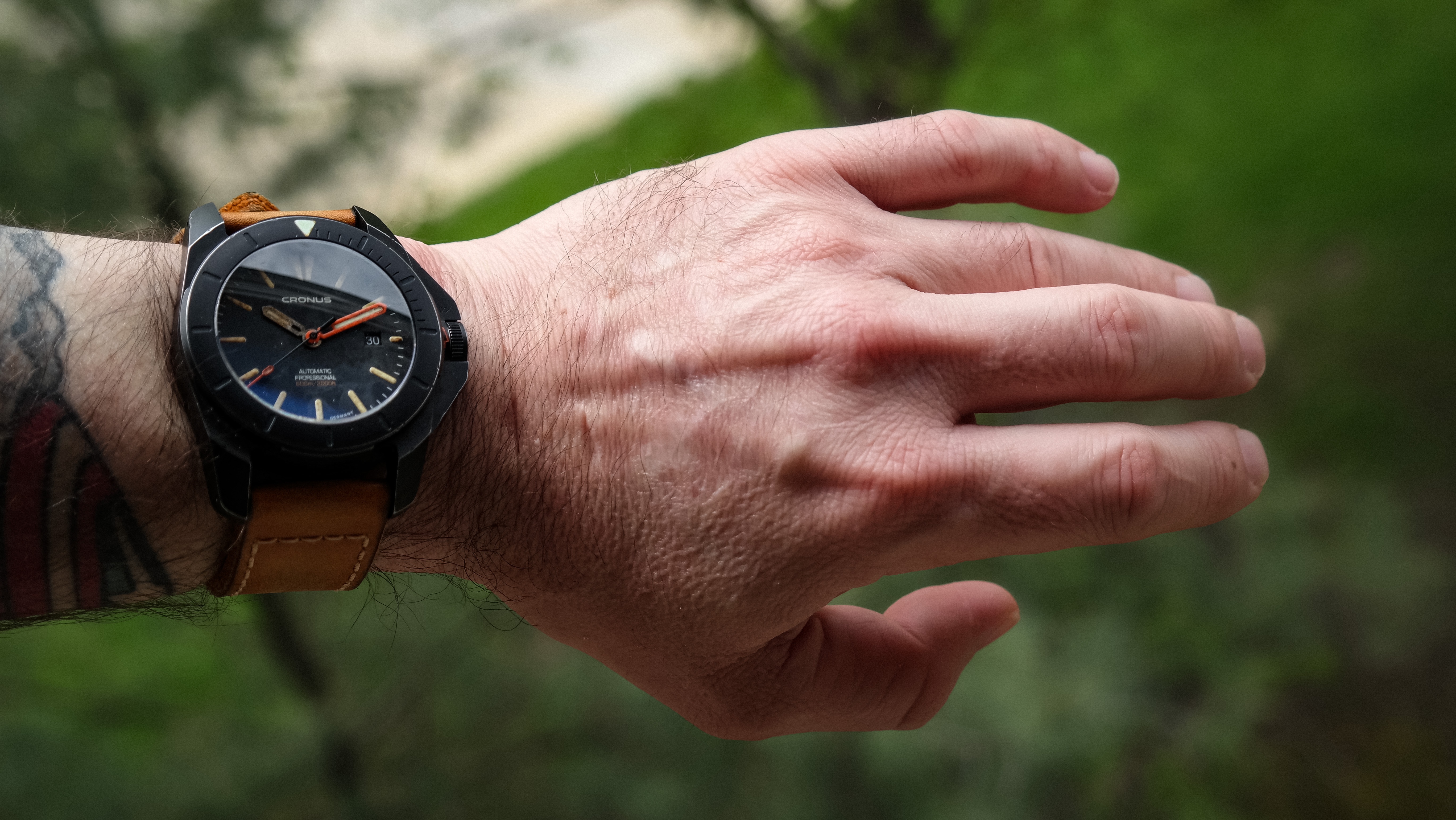 If you are looking for a watch that is made with that precision German engineering then the Cronus Prototype 3 is a watch worth checking out. I was extremely impressed with the quality, design and overall execution of this watch especially how authentic the aging looks on this watch. I said it before and I will say it again, Juri is a master beyond his years. You get a lot of watch for the price. This watch is priced on the Cronus website for 1500€. There is a strong German made watch market and Cronus can hold it’s own along side of companies such as Sinn, VDB, Damasko, and Muhle Glashutte. Juri did a thorough job with the planning and designing of the Prototype 3. I honestly can’t nit pick anything on this watch (aside for the mentioned date window) . The watch wears every bit of its 43mm x 15mm but it’s extremely balanced on the wrist. Some of the comfort of this watch is due in part to the super soft and pliable custom-style leather. This strap is not your typical cheaply made OEM strap either. It honestly looks and feels like a custom made strap that typically sell for a few hundred dollars. The buckle is absolutely fantastic as it too received that same beautiful engineered aging process . It’s solid like the case itself. I love how the pin sits flush on the buckle. In my opinion it’s a little detail but very impressive detail. The crown and crown guards are the highlight of the Prototype 3 as I mentioned in my review of the stainless steel version. I still would love a P2 watch from Cronus, it’s nice to dream about that is for sure. This watch has been forced to age and it’s just begging for some real world abuse to add to the already badass scarred character it possesses.