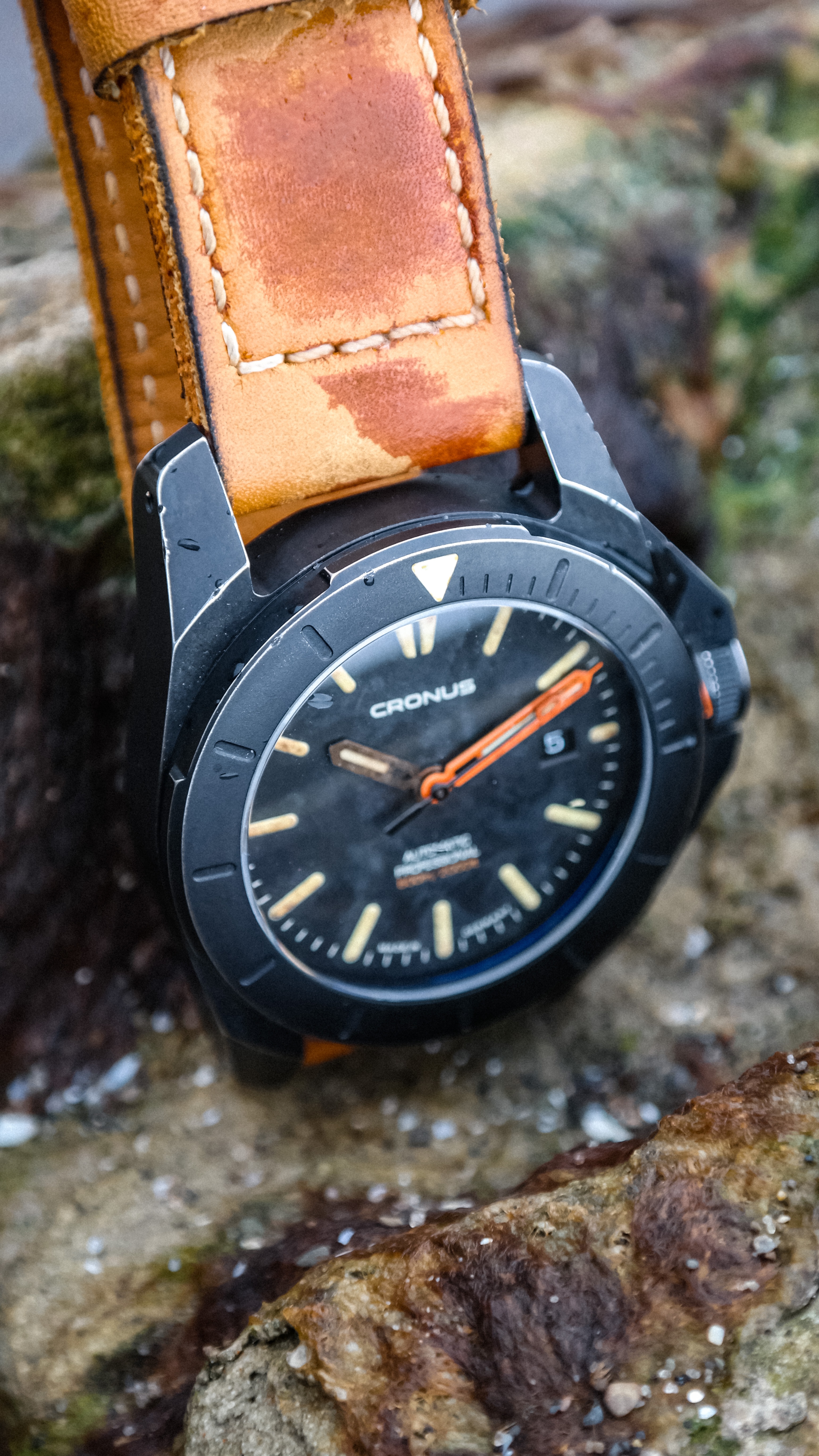The dial on this watch is simplistic beauty. What makes this dial work for me is there isn’t any unnecessary or overdone clutter. The dial has a simple amount of text that is kept to the brand name, movement type, and water resistance. The one thing that I could have done without on the dial is the date window at the 3 o’clock position. I do appreciate that Cronus opted for a black date wheel that allows it to blend in better with the rest of the matte black dial. The Prototype 3 is a three hand style design. Each of the hands are properly proportioned to the dial itself. I love the aging process that Cronus has done on this dial. The aging that has been done to the handset is so believable that they truly appear to be 40 years old. The retain every ounce of legibility in daylight and thanks to the generous amount of Superluminova C3, the dial is just as legible in the dark/low-light environments. The matte black dial has great patina that looks like the watch sat on the bottom of the ocean for decades. Depending what light and angle you view the dial, the patina looks more “severe” as you can see in the pictures.
