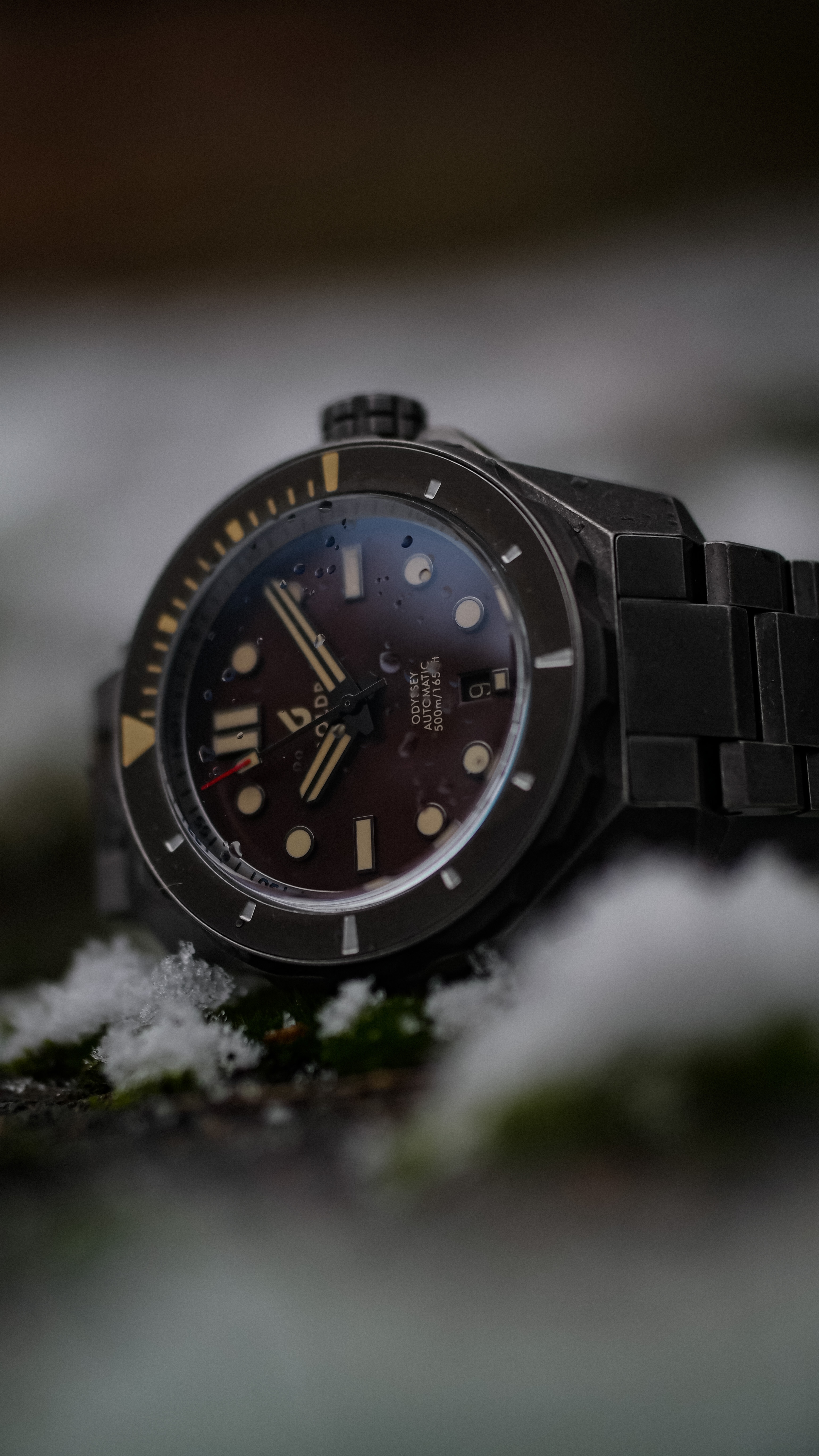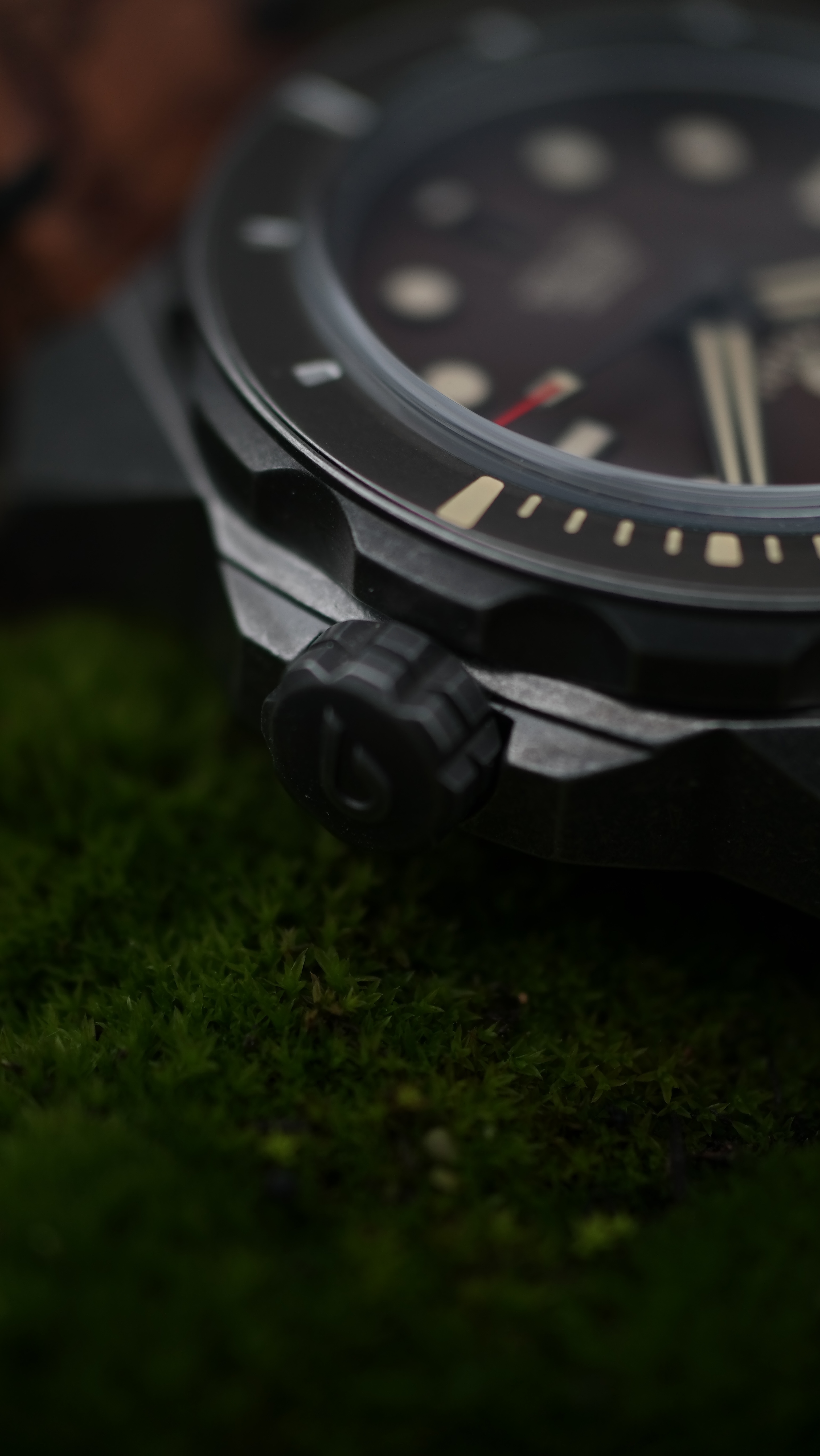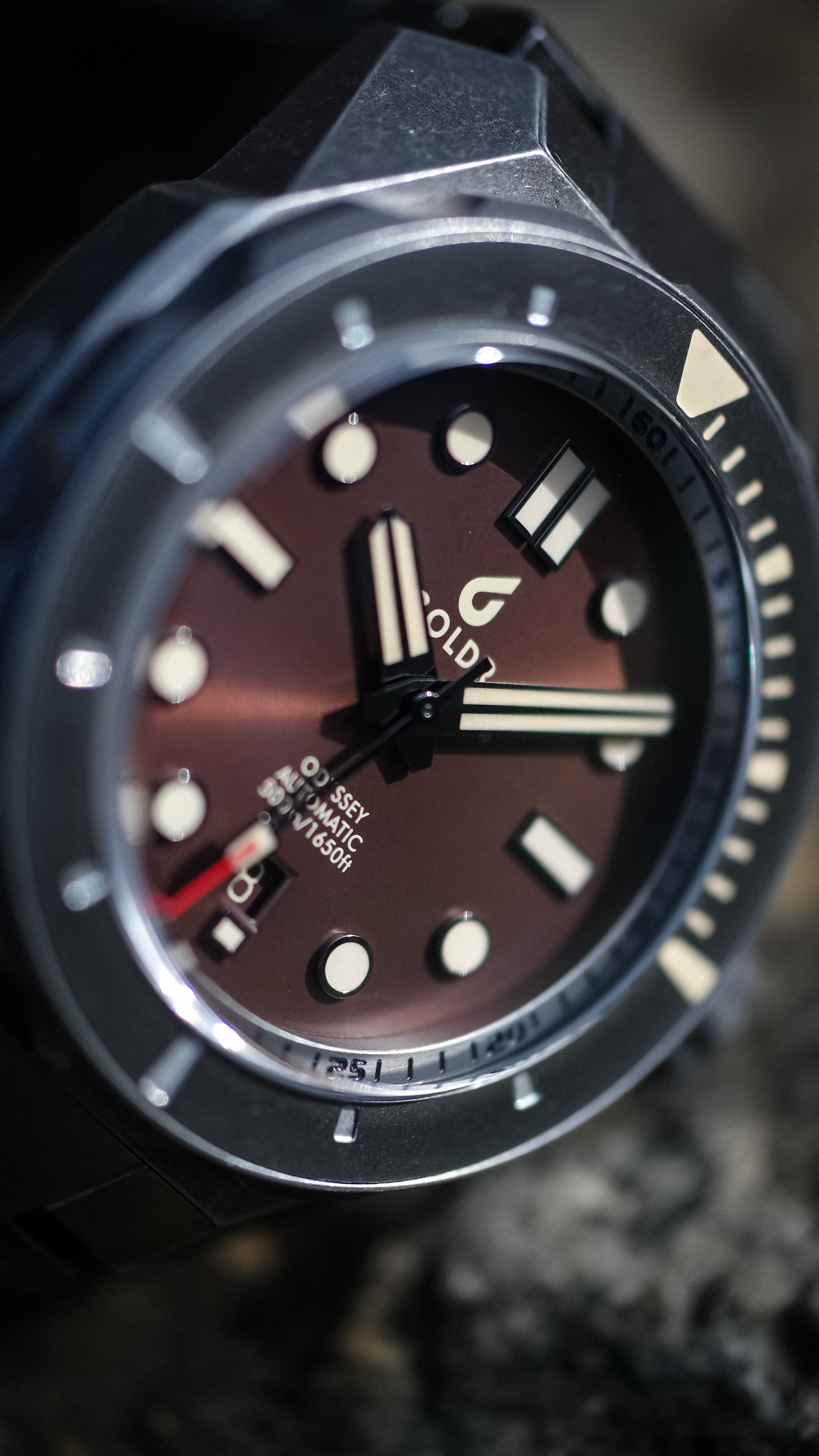 When the watch arrived, and my excited fingers opened up the mini-pelican style box, right out the gate the case of the watch is what I took notice of first. I wanted to talk more about this case first before diving into any of the other details. It’s such a badass case and I love that Boldr went back to its original Odyssey case design for this Coral Brown 2.0. The strong angular shapes that make up the Odyssey’s case is nothing short of magnificent. Those angles, teamed together with the aged steel PVD finish, delivers some of the strongest wrist presence I have seen from any Boldr. The lugs alone are enough to get my watch loving glands to salivate. You damn well better believe that I am loving the oversized screw down crown. I am such a drool-fool for the aesthetics & the functionality of a good crown, and Boldr definitely delivered on both fronts here. The crown is extremely easy to grasp a hold of, it screws in/out without any issues and looks awesome too because of it being signed with the raised Boldr logo. Even with my cold, wet fingers gripping and operating the crown was an easy task because off the way Boldr designed the edges of this crown. Why do I have to operate the crown when I am out in nature and the elements you ask?!? Watch photography 101 of course, it’s all about the ten & two.