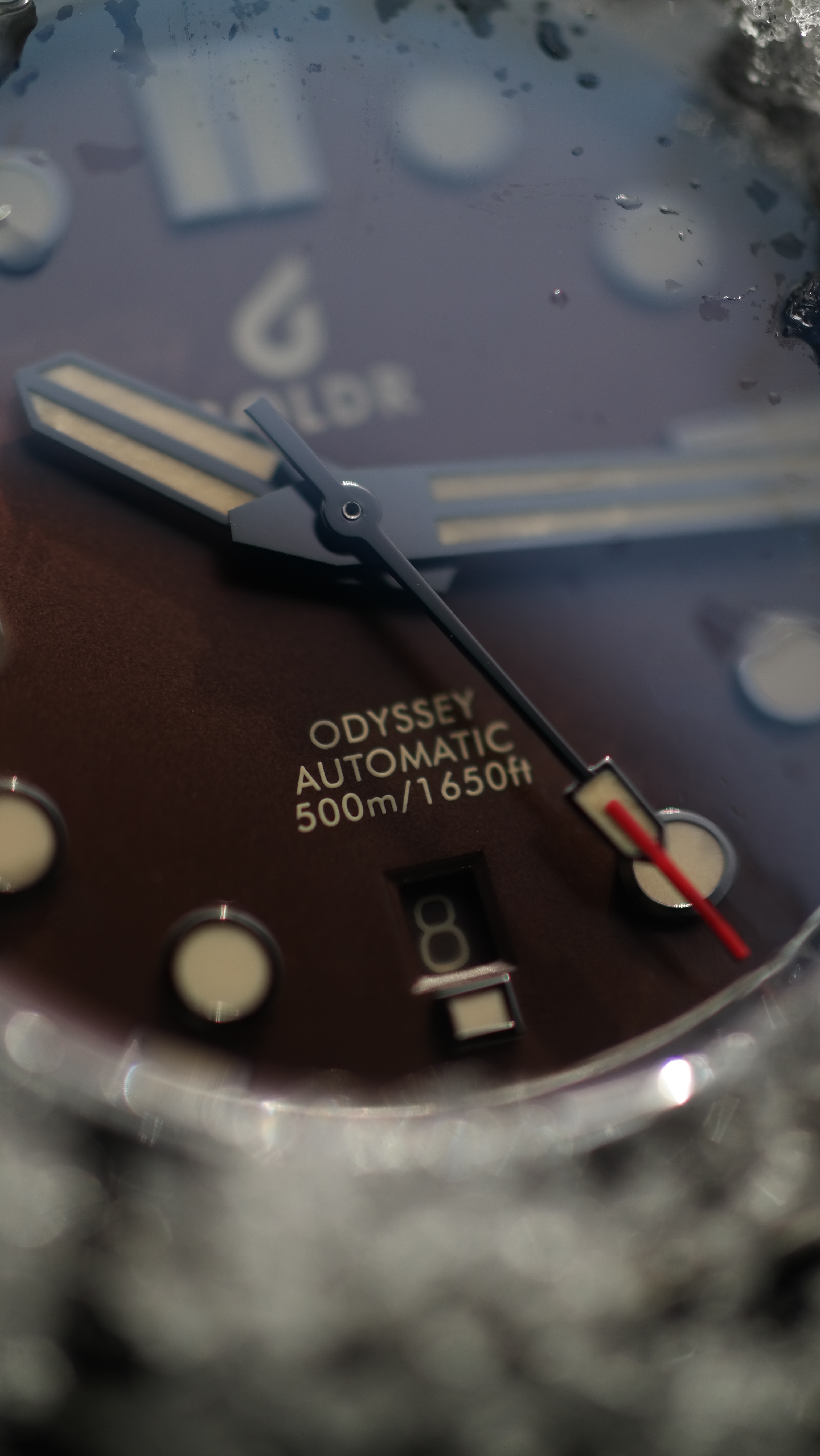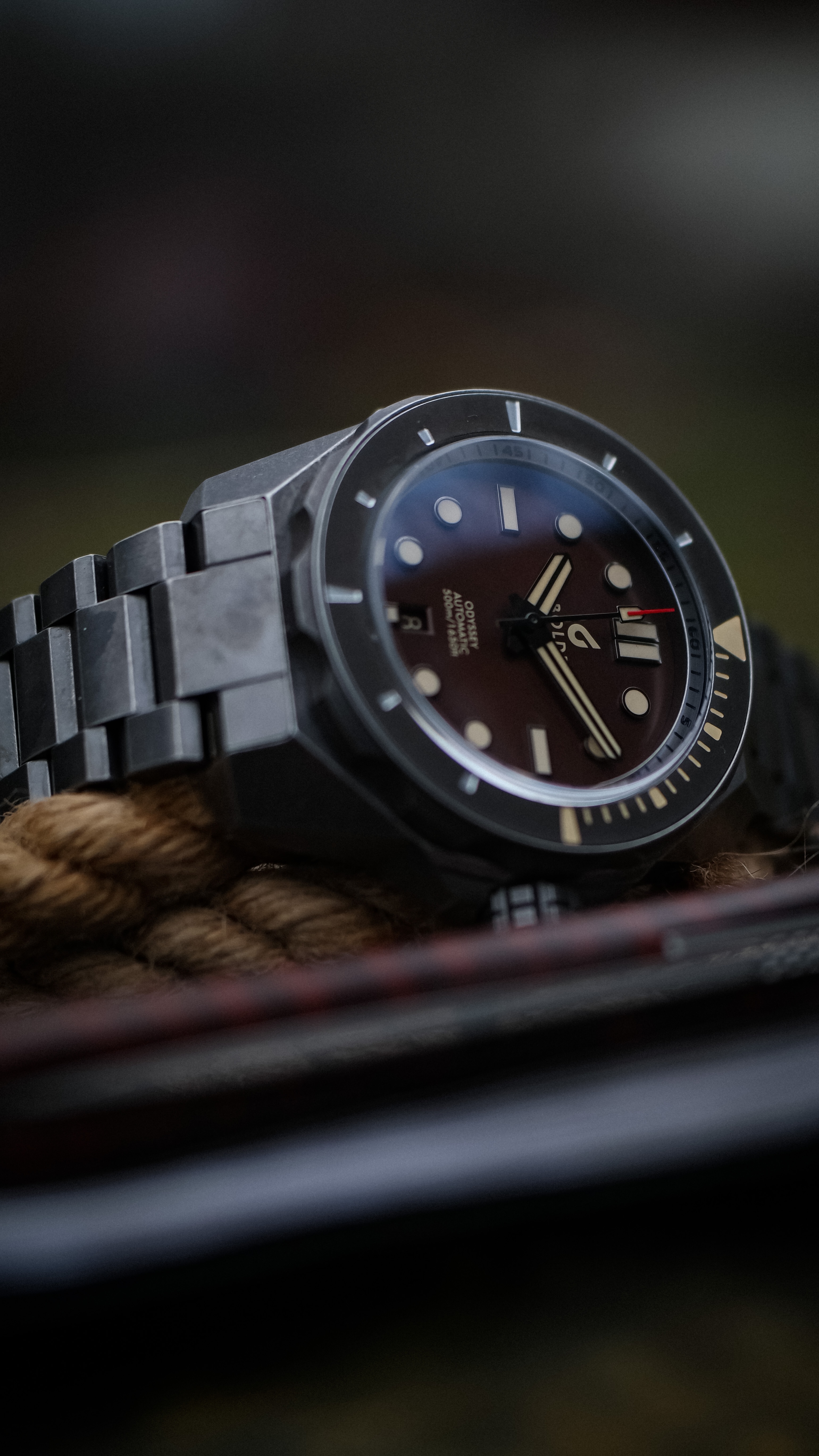 The soft cream color of the applied indices and hands creates a lovely cohesiveness with the brown dial. I love how the gun metal coloration of the hands ties into the aged PVD finish of the case. Boldr always does a great job with carry over of their design language throughout the entire piece. The touch of red on the tip of the second adds a small detail but a detail that impacts on a much larger scale. Boldr kept the text simple on the Odyssey’s dial with some bare minimum goodness. They included the Boldr name and logo under the 12H and above the 6H date window is “automatic” , Odyssey and the water resistance depth, which for this diver is 500M/1650ft. I could have done without the date window but I know there are plenty of people who appreciate them. It’s certainly a detail that I can live with and won’t break any deals for me. What Boldr did to help with helping to keep this dial clean is that they included a chapter ring that has the minute/seconds markers printed on it.