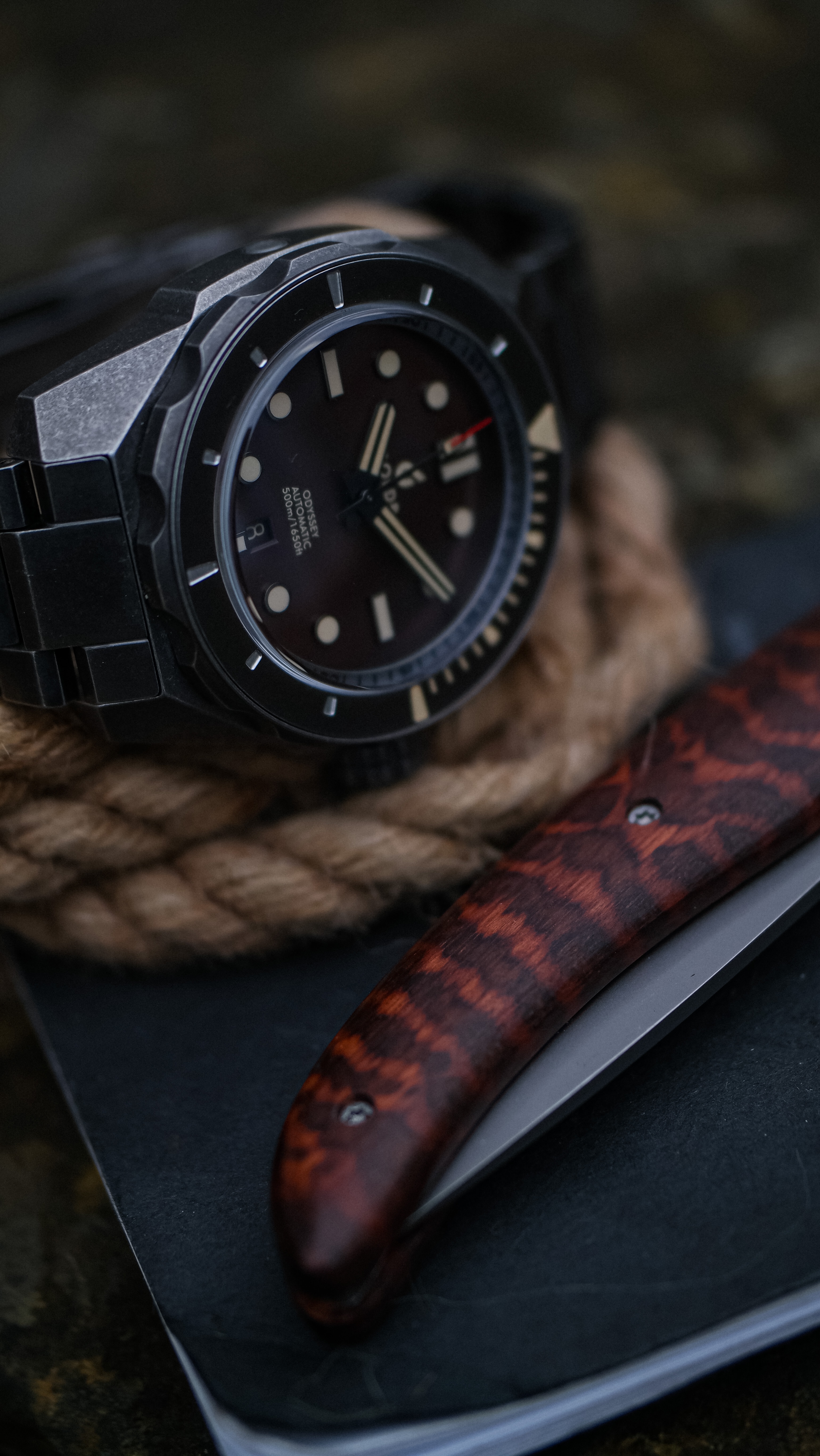 Honestly that’s the only change I would make to the Odyssey 2.0. The highlight of this piece for me is how well done the aged PVD steel case and bracelet are done. I love how it looks like it’s made from granite. Boldr carrying over this detail from case to bracelet is wonderful to see the consistency of the design language. This watch has some major wrist presence as a result of that consistency and it even retains some fantastic wrist presence if it’s on the rubber strap or a custom strap. Boldr’s line of Odyssey divers are built for ASA, also known as adventure sustained abuse. The 2.0 is no different! It’s a watch you won’t have to worry about once you strap it onto your wrist and if it sustains some scars, it will only add to the badass look of the aged PVD steel. Boldr makes adventuring more fun not only with this grab & go watch, but even more so because of their line of grab & go knives. The watch and the knife are great choices for any fan of EDC gear!