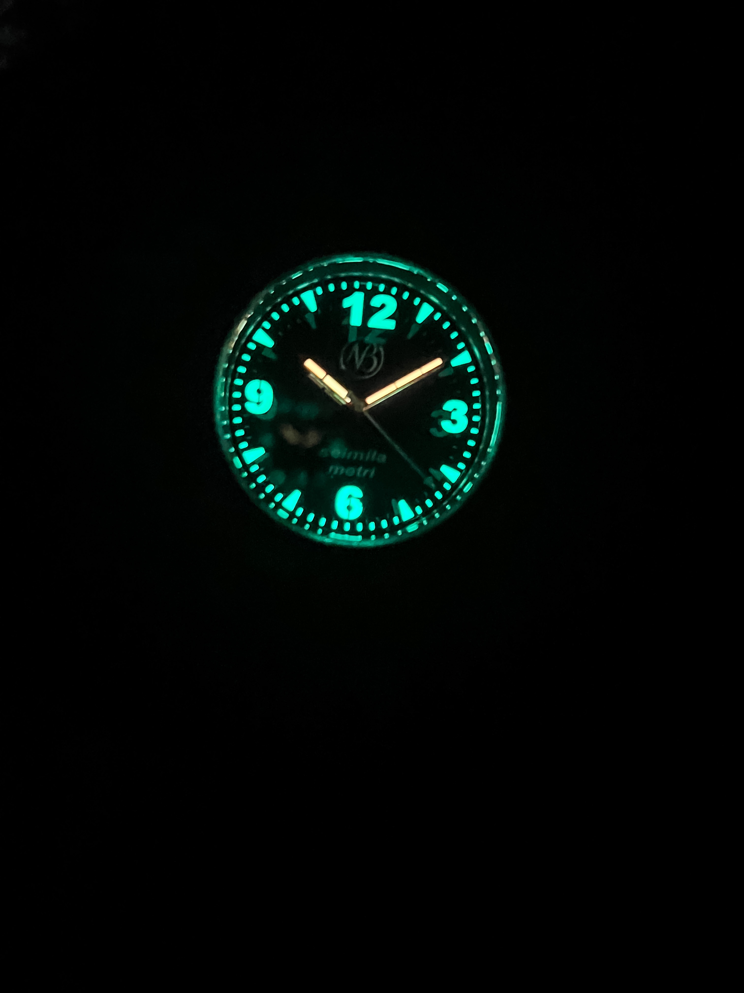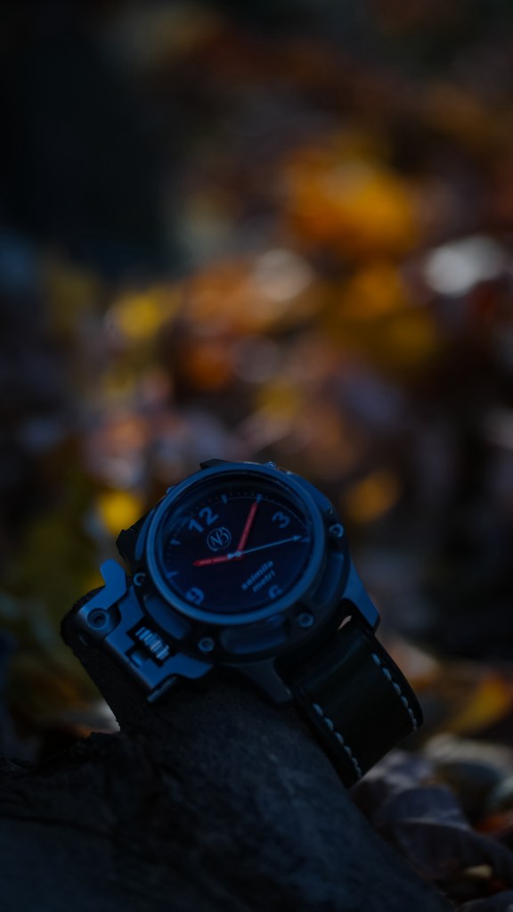 Once the sun goes down, that white glows a magnificent shade of green. The red/orange hour hands add to the legibility and the white second hand is the cherry on top of this legibility sunday. There is something just so classic about the cardinal 12, 3, 6, 9 hour markers. I like the way that Ennebi added in the other hours, minutes/seconds markers. They aren’t anything big or busy, but it’s just enough to add a welcomed amount of detail. I can say the same thing about the NB logo and the model name that are printed in white on the dial. I will take a lume shot so you can see the color of the hands. The lume is something to behold. It was a pleasant surprise.