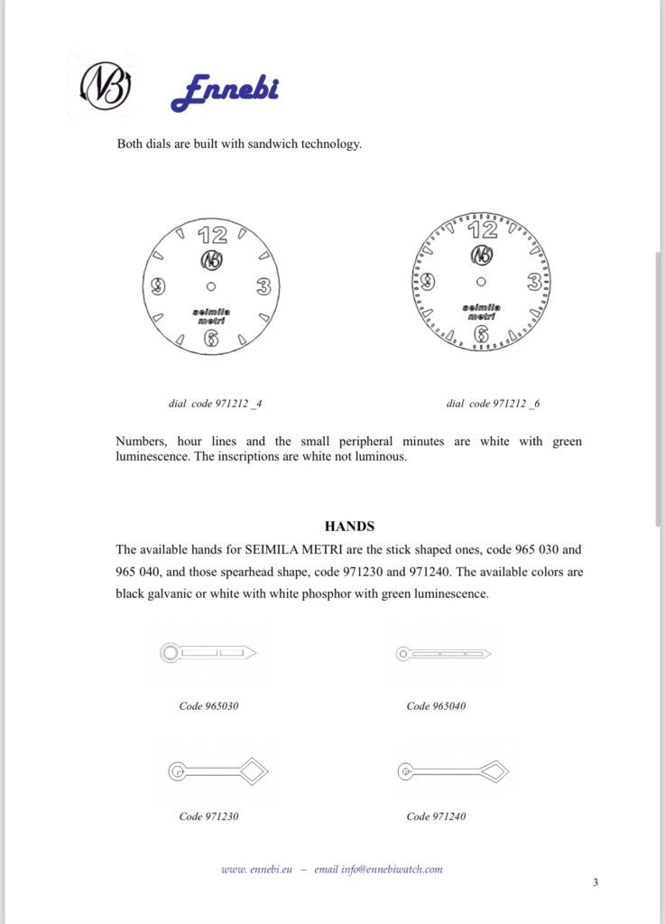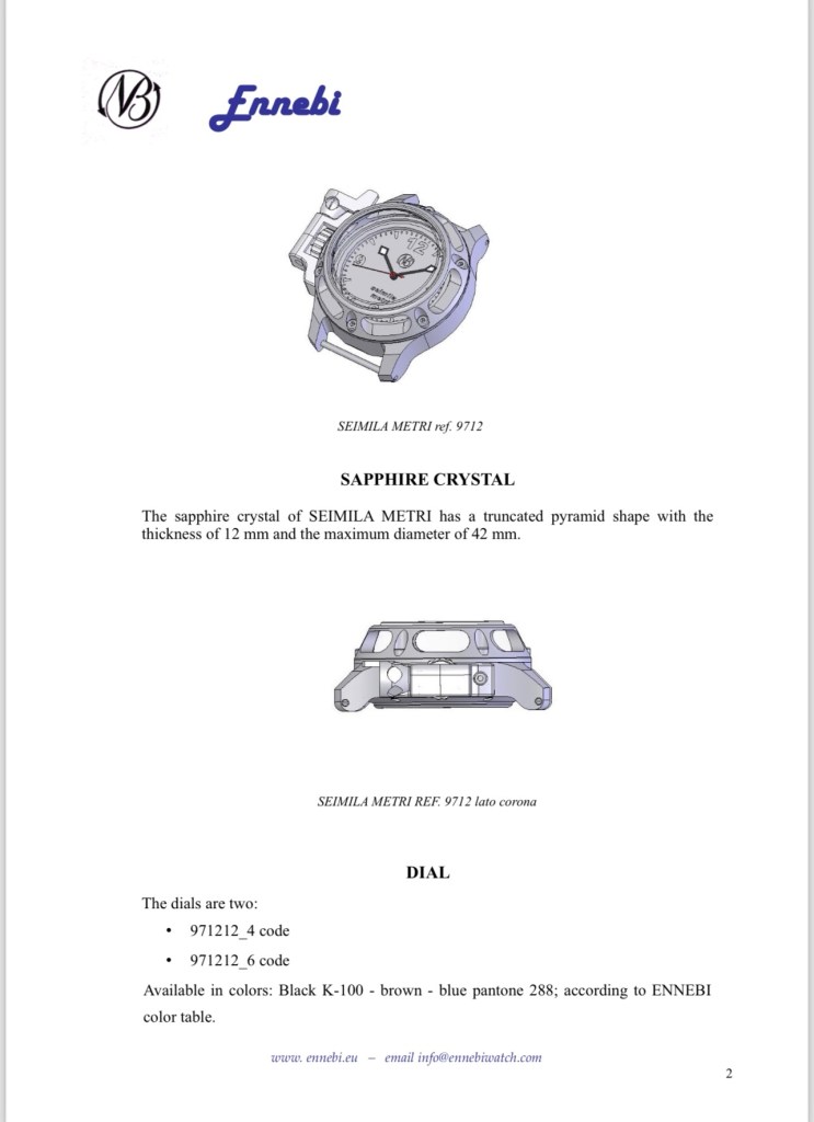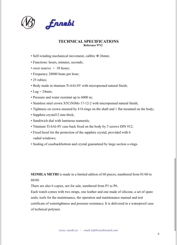 The material adopted for the watch is grade 5 titanium, Ti 6Al 4V. The mechanical workings of the body of the Seimila metri are similar to those of other Ennebi watches. I enclose a descriptive document of this watch.