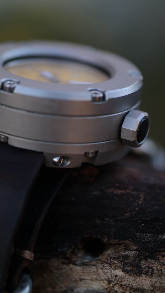 This cylindrical case reminds me of a piece of equipment from Captain Nemo’s submarine from a League of Extraordinary Gentlemen. As you can see from the pics, this boy is thick. It sits tall on the wrist which gives it a cool and unique wrist presence. Its lugless design allows it to wear extremely manageable on the wrist. Top heavy yes, but zero wrist overhang. If you are one who worries about case size, then you wouldn’t be looking at this watch anyway.