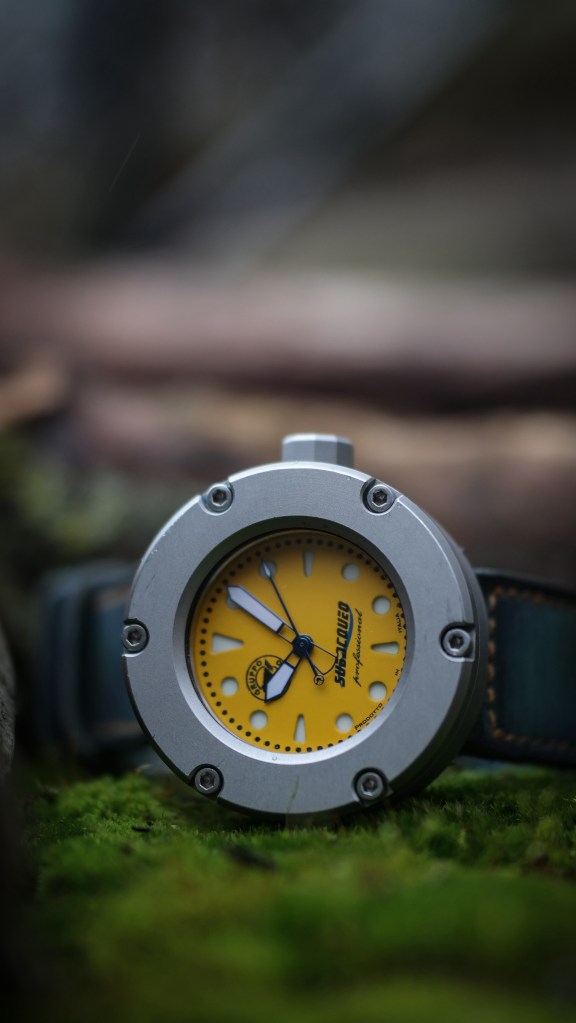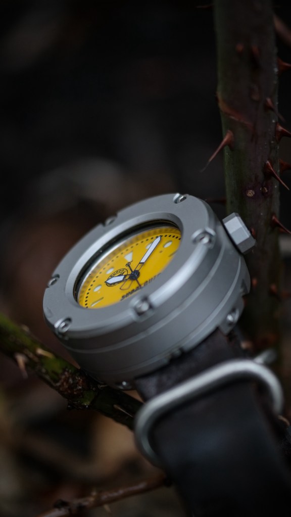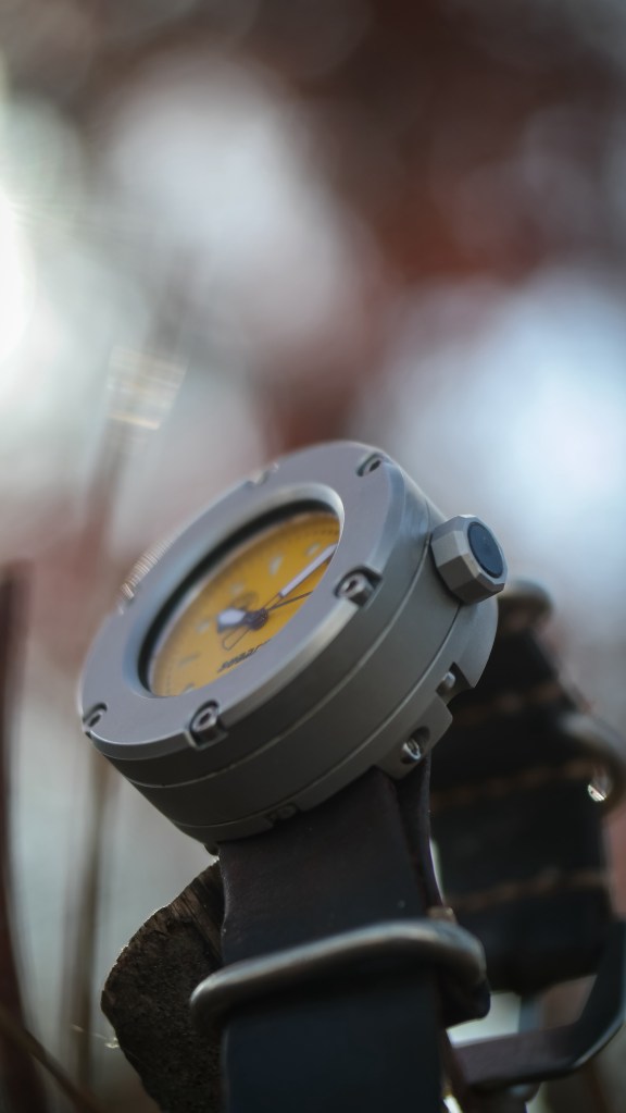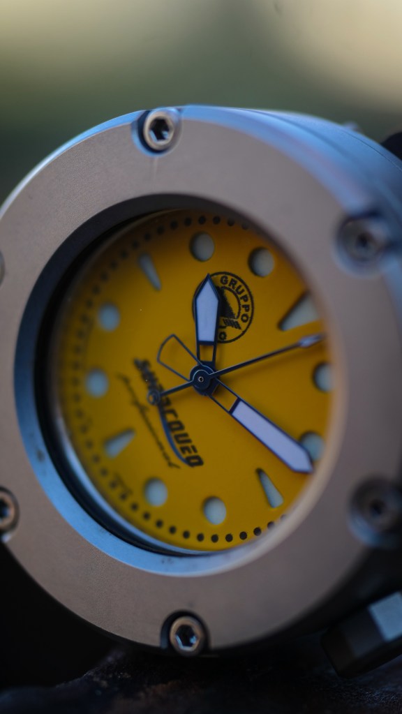 This piece is amazing me the more time that I spend with it. The bead blasted stainless steel case goes so well with the matte yellow dial. I appreciate the design of this case. It reminds me of some sort of WW2 era submersible device. This is an excellent example of the bespoke watch design and engineering that I truly love. The lugless design adds to the uniqueness of this watch. I really appreciate how Gruppo Ardito has that cohesive design language that flows so well between all of the details, especially between the lugless design and the no crown guards. This gives the watch an even more pronounced cylindrical appearance.