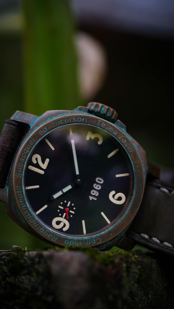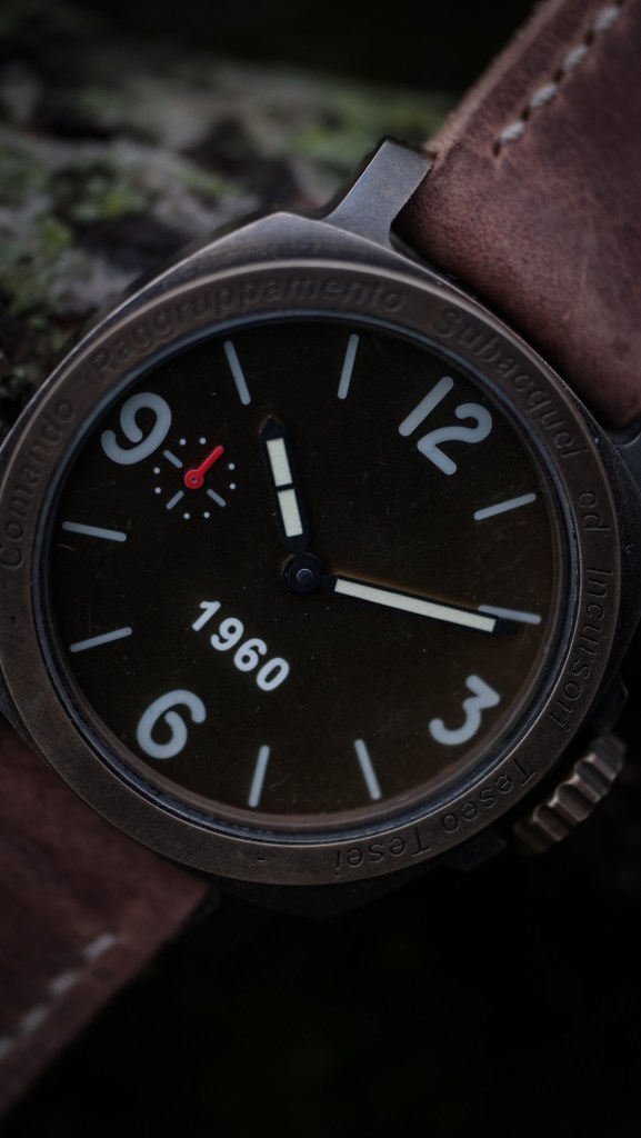 The fixed bezel is engraved with “Comando Raggruppamento Subacquei e Incursori Teseo Tesei” which is the Italian Navy’s special operations unit, Teseo Tesei was an Italian naval officer who invented the Maiale, aka the human torpedo. The Italian frogman group are named after him. I won’t go too far into the history lesson, but if you’re interested in reading more about this group or Teseo himself, there is plenty of information via google. I love the way the fixed bezel looks with the engraving’s encirclement of the dial. I was thinking to myself that the letters would look incredibly cool with some green patina lying inside each of the engraved letters.