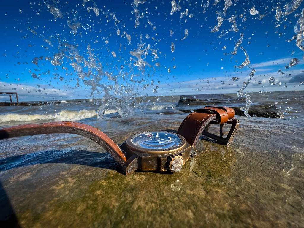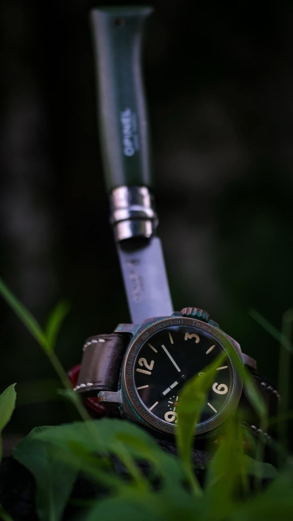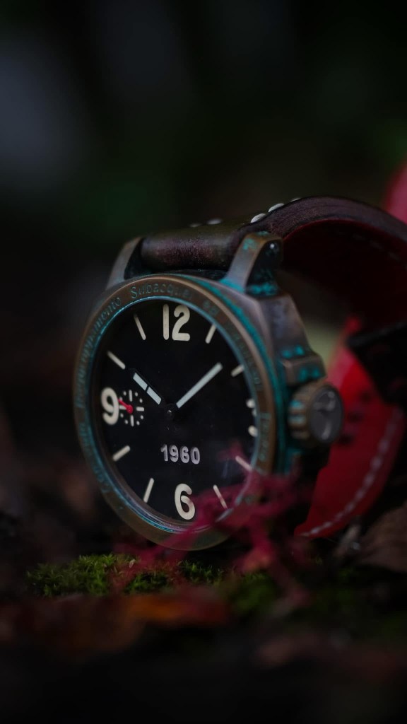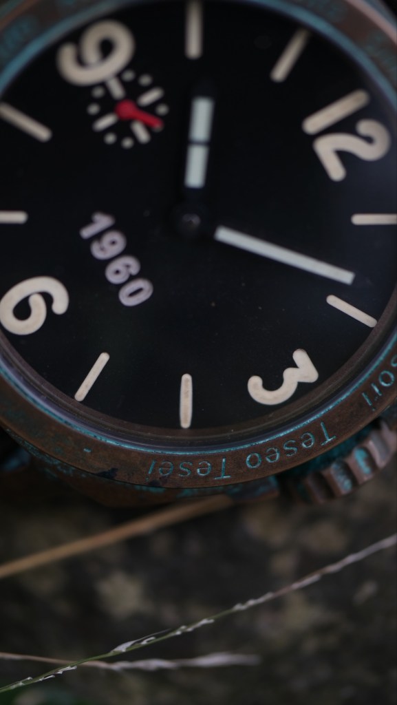 Speaking of bronze and patina, for those of you who don’t know, this case is B14 bronze. The B14 alloy is known for being a very hard and a very tough bronze with an excellent resistance to corrosion. It’s a great choice for a watch case because how well it can take and relatively withstand impacts, wear, abrasion, and high temperature; resistant to high hydraulic pressures, good anti-friction quality and finally B14 has good resistance to cavitation and corrosion by seawater. Information from Broncesval.