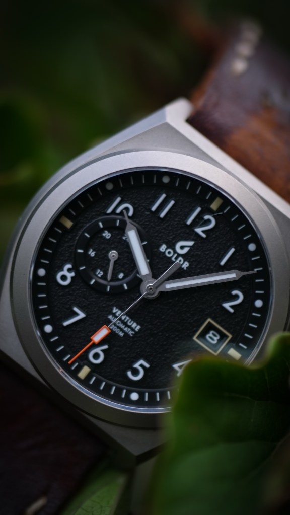 Boldr Thursday with the Venture Wayfarer-Black. And boy is this dial black! This beautifully textured dial is the perfect backdrop for setting the tone of this watch. I will always be drawn first and foremost by black dials, just as long as it’s not a glossy or sunburst dial. The matte textured dial on this watch adds the first layer of depth. The raised white numerals are the next layer of depth on this dial and I have to say they nailed these numerals. I like how legible the numerals are because of the white set against the black dial adds to the legibility but the fact that they are also raised really allows the numerals to pop. I love when a dial has quick glance legibility. Sometimes all you have is a split second to glance at your watch especially if both of your hands are occupied but you need a quick glance to record the time. It happens to me multiple times during the day at work, so I appreciate the legibility of this dial.