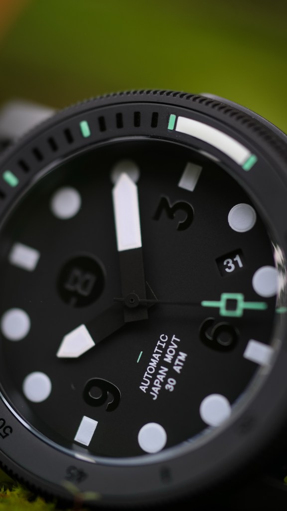 I thoroughly enjoy this Diver 2.0! It’s such a refreshing watch because of its unique take on a dive watch. It’s well made, full of great little details and is an absolute pleasure to wear. The wrist presence of this black beauty is so damn good and all the little details on the case just add to that presence. For example, the little “plaque” off the crown with the engraved white filled ‘Diver 2.0, Titanium, 300m’ gives the crown side of the case that little extra zaz that creates a great eye catching detail. It’s eye catching because it’s not a typical detail you see on all the same old redundant dive watches. Minus 8 also added some nice eye catching detail on the bezel insert with the combination of the white and mint green accents that tie in nicely with the details on the dial. They took a step further with the black numerals on the insert for that cohesive grand slam of matching the black numerals on the dial. I truly appreciate when a company commits to a cohesive design language that is evident throughout the dial and the case.