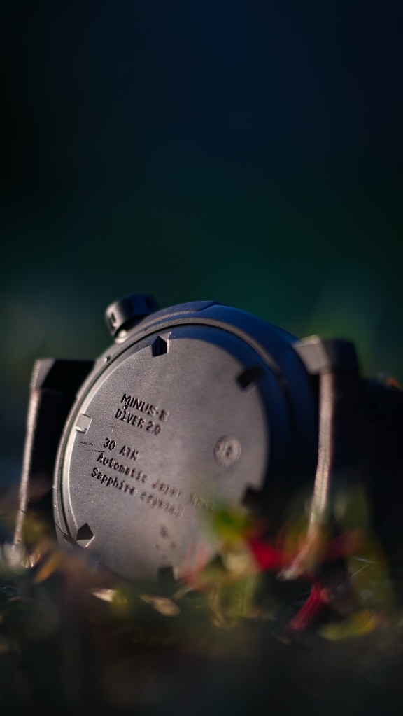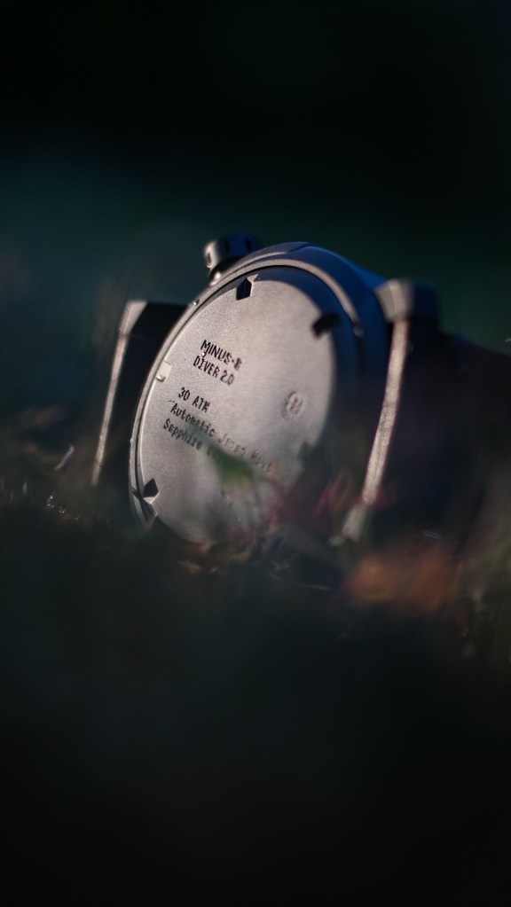 The Minus 8 Diver 2.0 has such a minimalistic case back. I think it works brilliantly with the overall design aesthetics of this watch. The simple engraved text is well done and precise. I think the -8 logo finishes the caseback off with keeping it simple. I also appreciate how Minus 8 pulls all the text together on the Diver 2.0. The dial text, the text near the crown and the text here on the caseback, it all comes together in an organized cohesiveness. All of the design choices on the Diver 2.0 come together making this watch a unique take on a dive watch. The market is saturated with divers, so when a company has a unique take on a dive watch you know I will be into it. I can see this watch appealing to fans of dive watches whether you like more classic designs or if you like more unique designs. This watch is right in the middle of that.