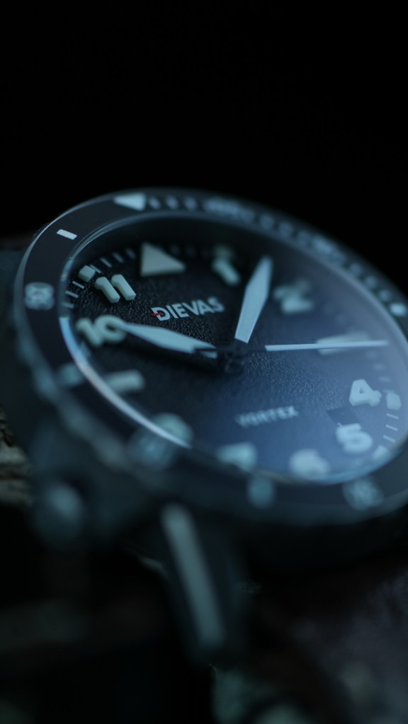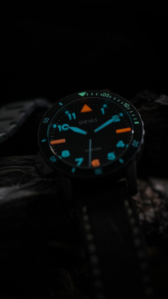 The hands are proportioned perfectly to the dial, something that Dievas has always successfully demonstrated the ability to match the hands size to the dial circumference. Dievas also nailed the lume on this Vortex. I love how they used different colors of lume throughout this watch. It’s unique and creative, a different approach to adding depth to a dial in the darkness.