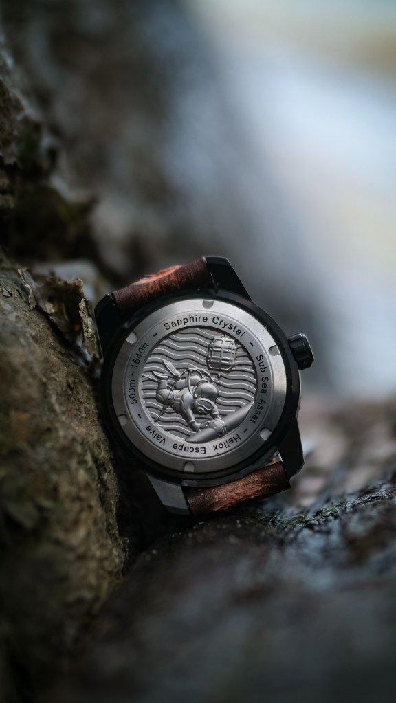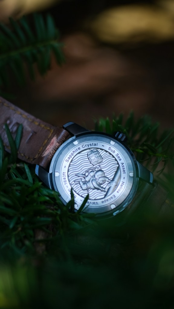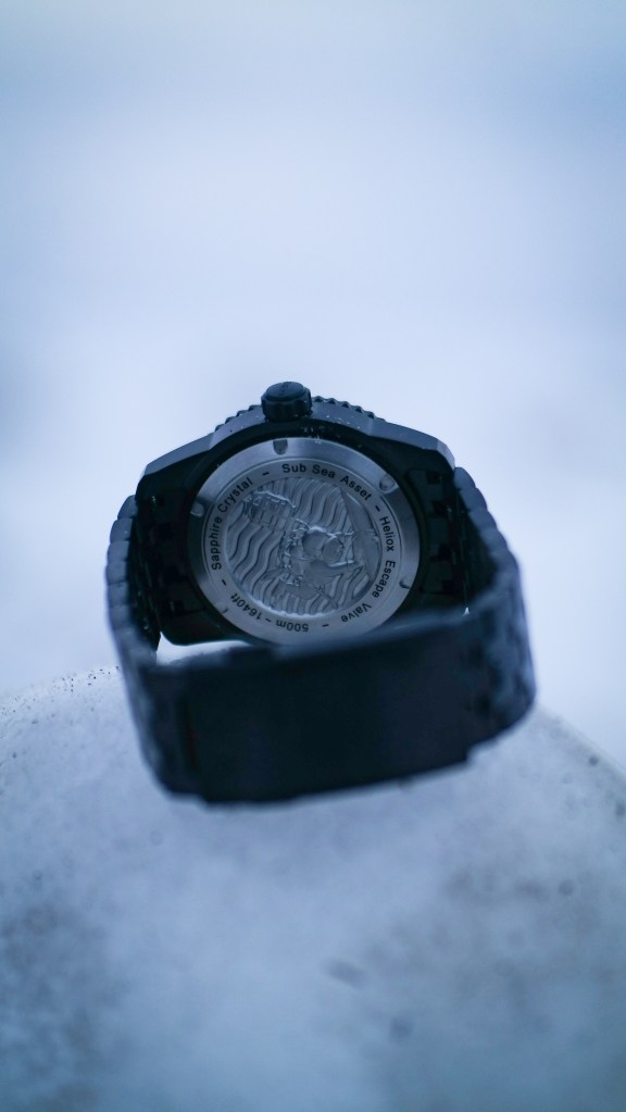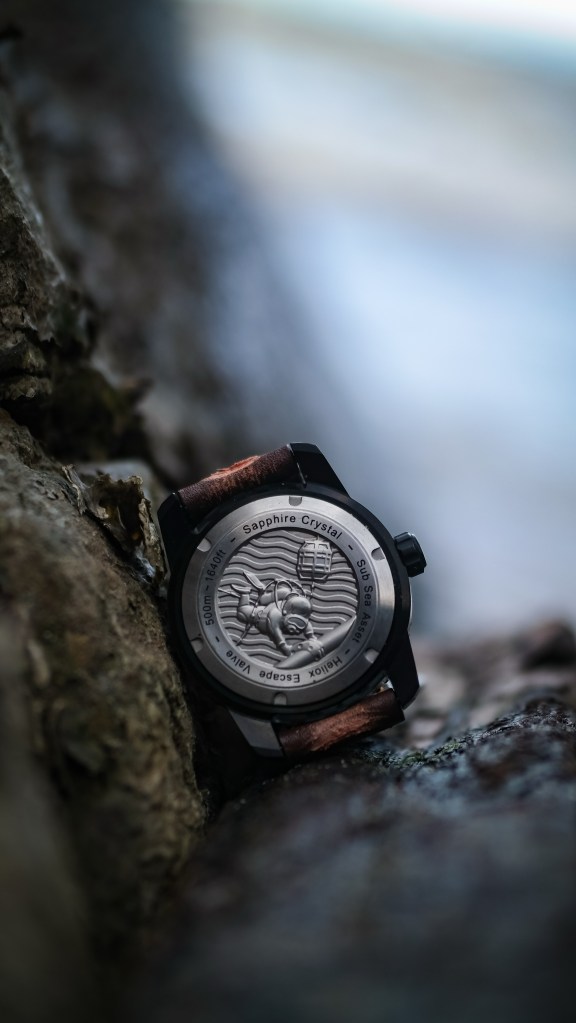 I love the dark case teamed with the caseback. The caseback art was created by ex-Comex diver and award winning artist Jock Patterson. It’s pretty badass that Paul is a commercial diver and his watch features artwork from a Comex diver. There’s an added magic on Scurfa watches.