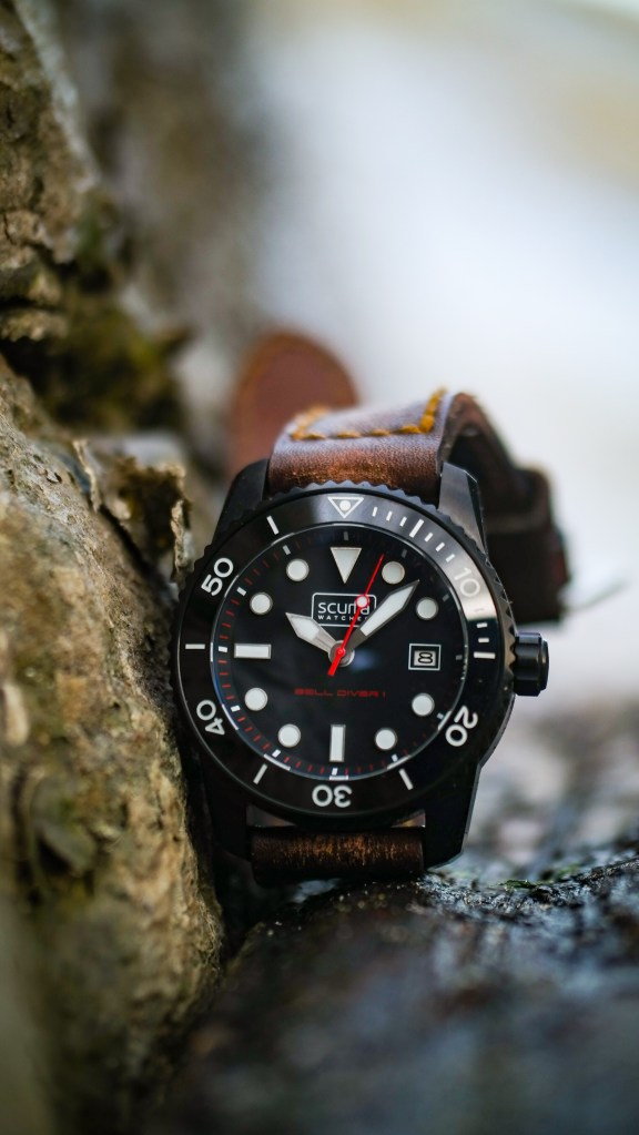 The bracelet definitely dresses up the Bell Diver but if bracelets aren’t your thing, Scurfa includes a rubber strap as well. If rubber or bracelets aren’t your thing either, then custom straps work beautifully on this watch as well. When I was done shooting these pics I put the BD-1 on a custom leather Gunny strap. So damn good!
